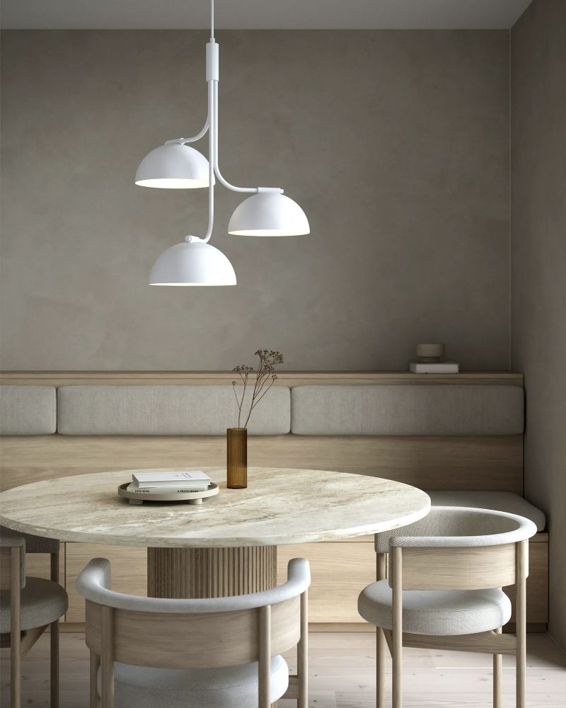 Med sine tre runde skærme skaber Tullio-pendlen en elegant helhed, der fanger opmærksomhed og tilføjer karakter til ethvert rum. Lampeskærmenes diffusorer sikrer et ensartet lysfelt og et behageligt blændfrit lys, så du kan nyde en hyggelig atmosfære i hele rummet.