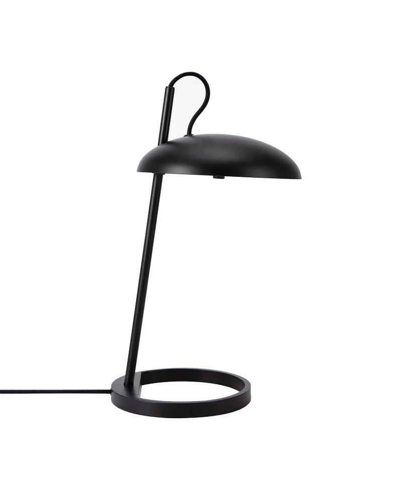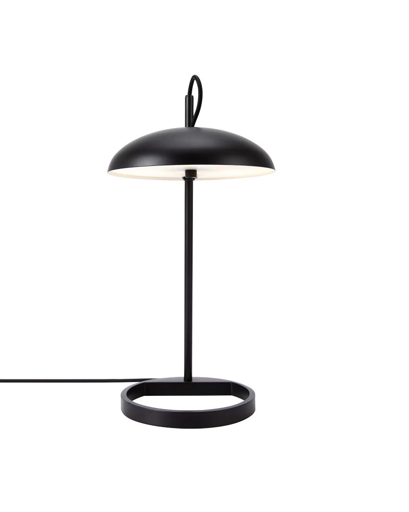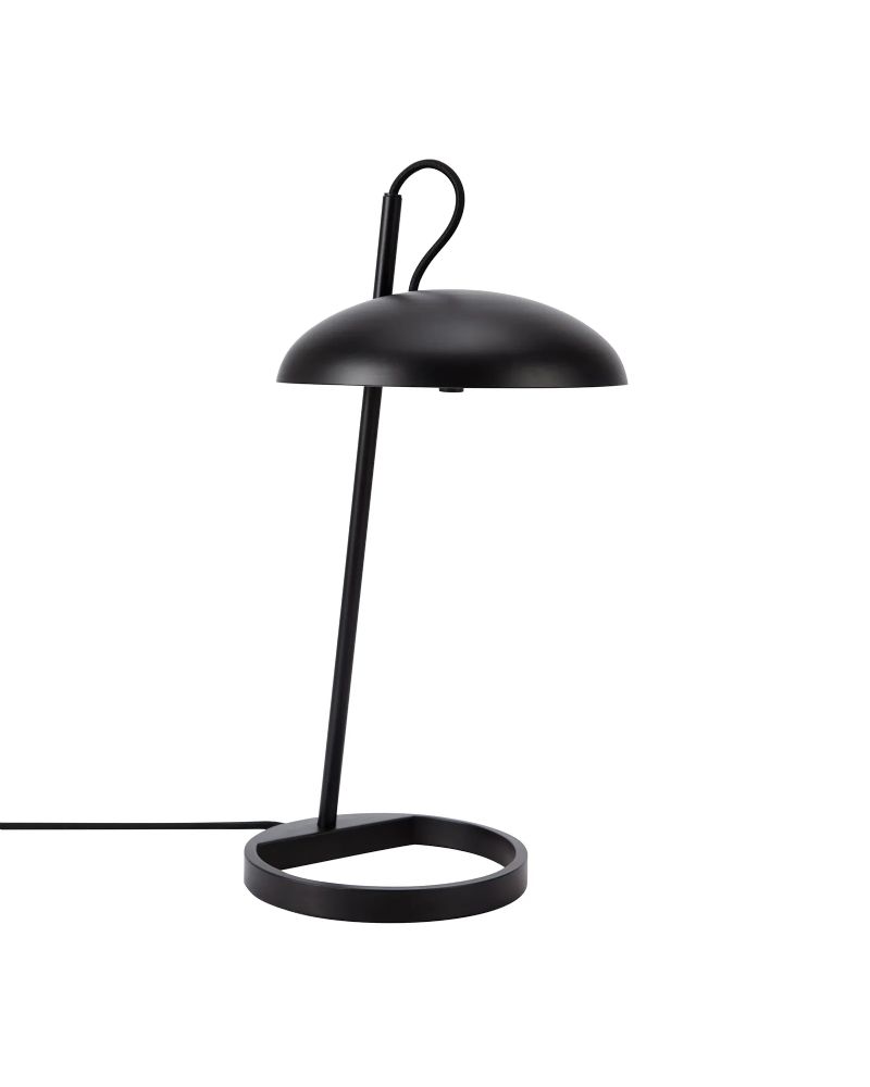 Lampens materiale af metal og dens flotte, sorte farve giver den et eksklusivt udtryk, som gør, at den skiller sig ud fra andre lamper. Dens runde skærm, der giver en ensartet belysning, og dens højde på 45cm gør denne lampe ideel til at blive placeret på et skrivebord, en skænk eller et sengebord.