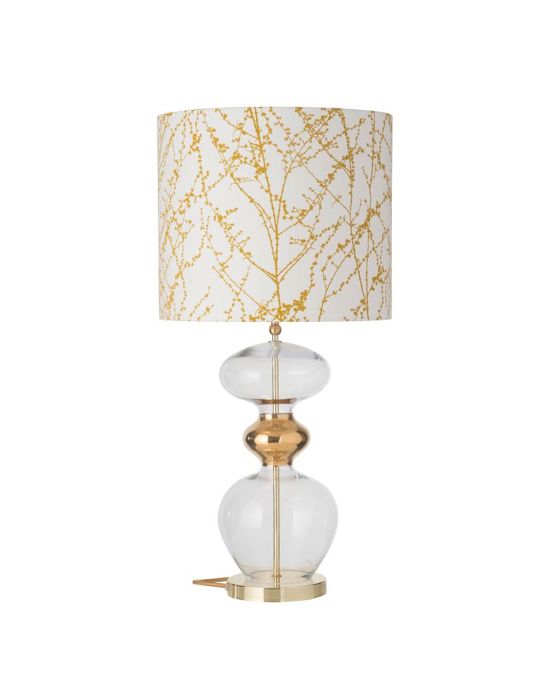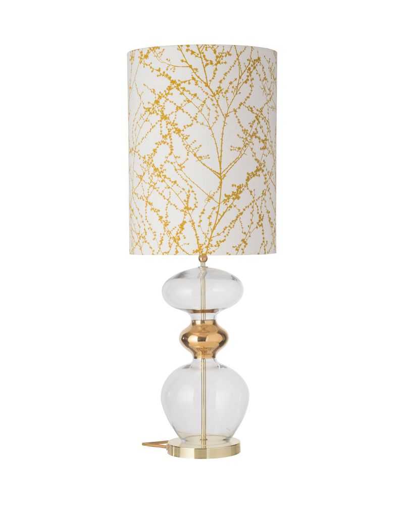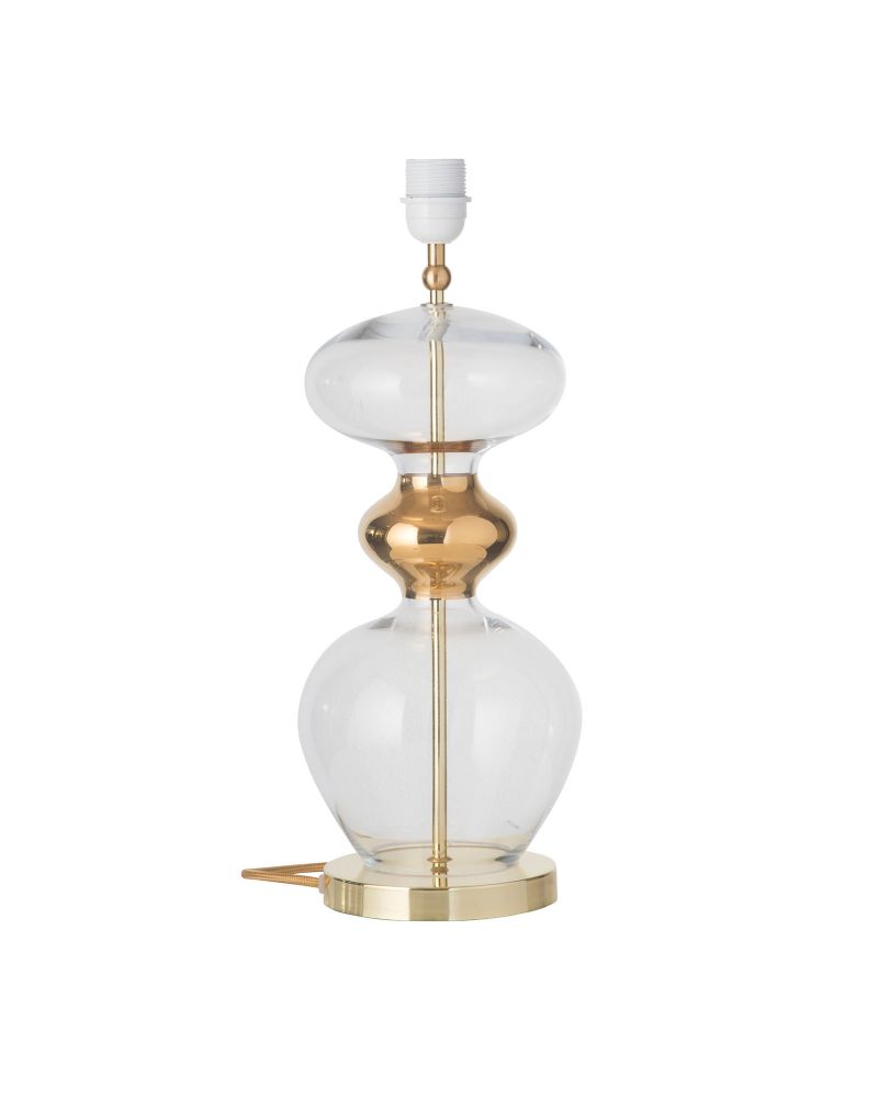 Futura lampefoden består af en smuk mundblæst glasform i klart glas. Glasformen er delt i midten af et guldfarvet metallisk bånd. Lampefoden hviler på en stilren base af metal.