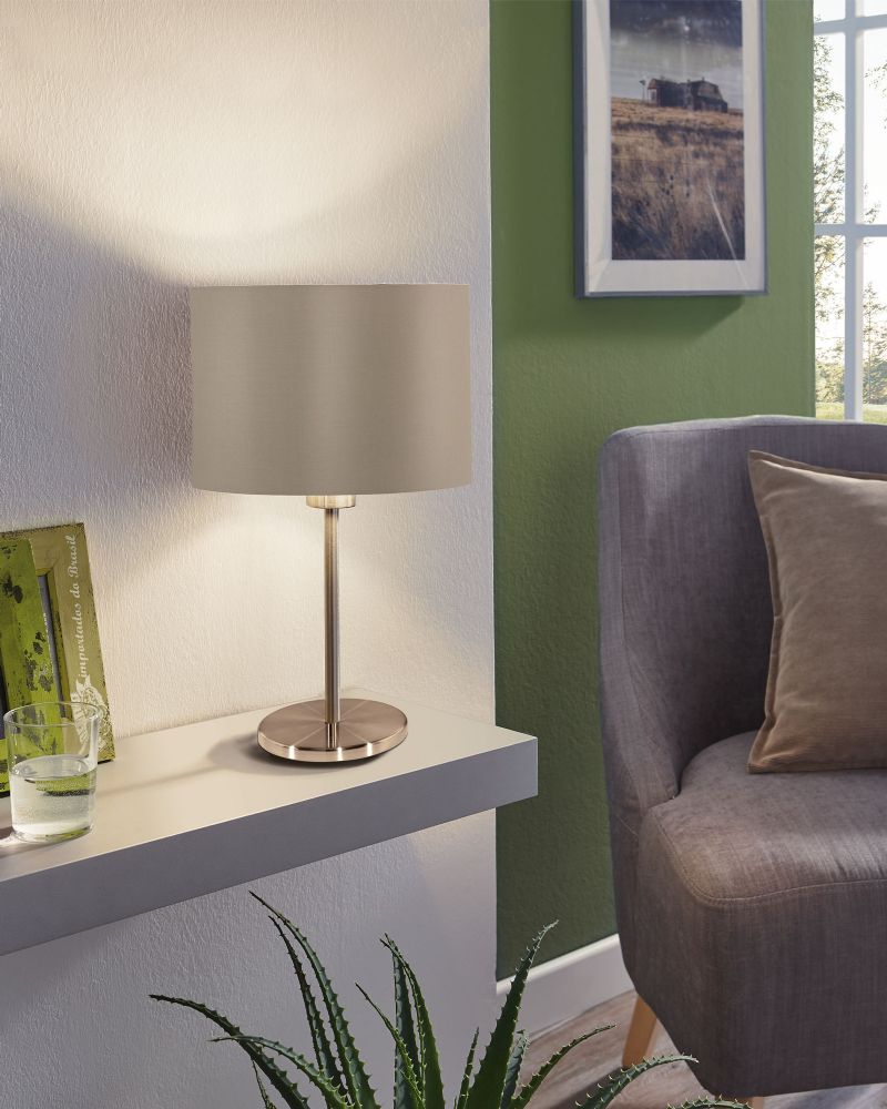 Denne stilrene bordlampe findes også i farverne cappuccino, sort/guld og grå. Der er ingen tvivl om, at EGLO’s lampeserie Maserlo er kommet for at blive. Serien byder på både pendler, bordlamper, gulvlamper og væglamper. Vi anbefaler, at du kombinerer flere lamper i serien og på den måde skaber en flot sammenhæng mellem dine lyskilder i hjemmet.
