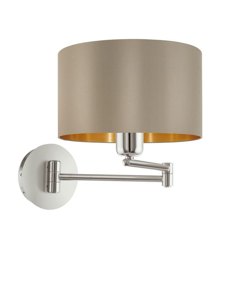 Lamper skal både være praktiske at anvende og smukke at se på. Det krav har EGLO’s væglampe i den populære Maserlo-serie ingen problemer med at opfylde. Den fine tekstilskærm med den gyldne inderside tiltrækker sig opmærksomheden, mens drejearmen er også flot udført. Væglampen findes i denne model samt en tilsvarende, hvor skærmens farve er sort/guld. Kan du lide lampens udtryk, er du måske også interesseret i at se vores gulvlamper, pendler og bordlamper i samme serie.