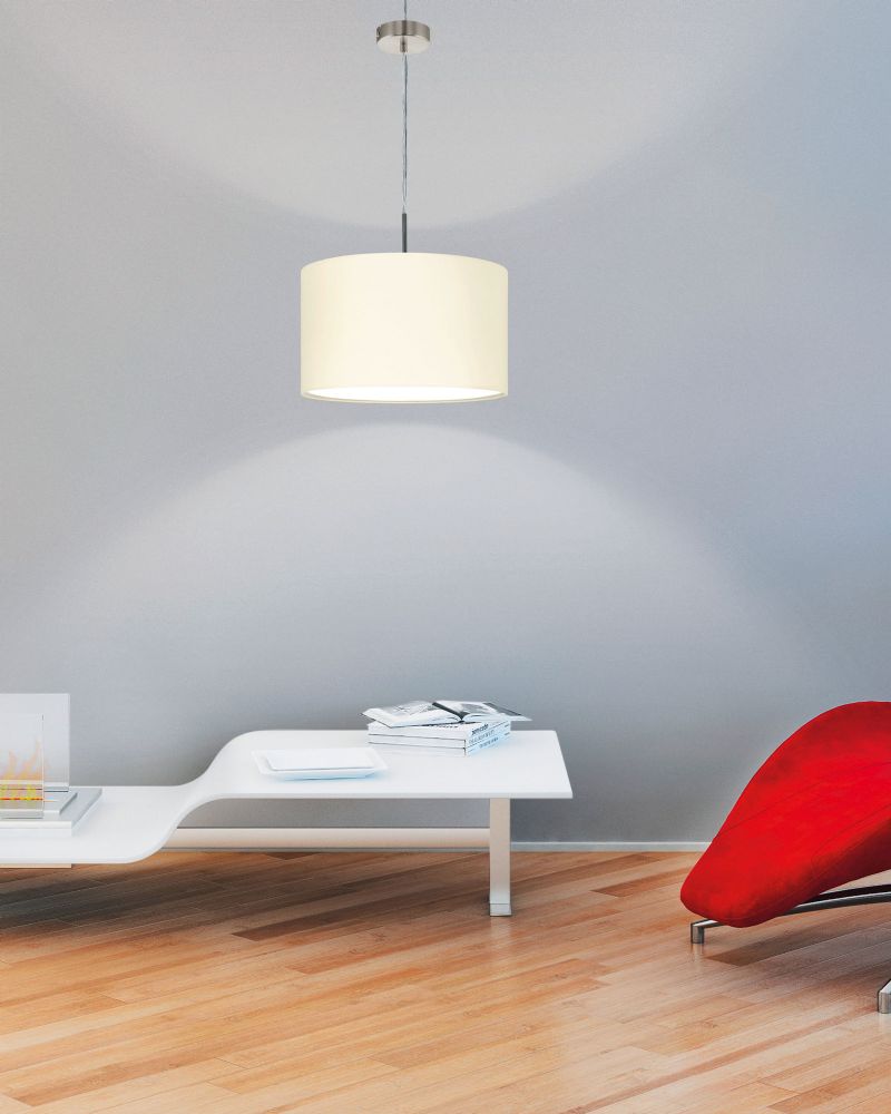 Den stilrene pendel med hvid tekstilskærm passer godt ind i de fleste hjem, hvor der sættes pris på moderne design. Pendlen fås også i farverne taupe, grå, antracit, hvid/kobber og sort/kobber. Vælg mellem denne model med en diameter på 38 cm og nummeret større med en diameter på 53 cm. Se også de andre lamper i Pasteriserien, hvis du vil inspireres.
