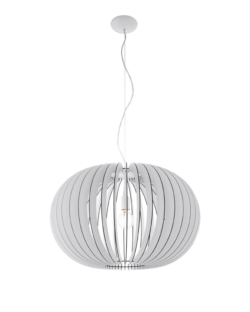 Den flotte lampe består af buede trælameller, som tilsammen omkranser lyskilden. Lyskilden er således synlig, og vi anbefaler derfor, at du vælger en flot pære som fx en glødepære.