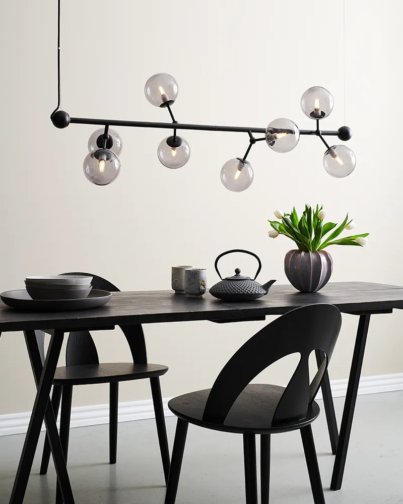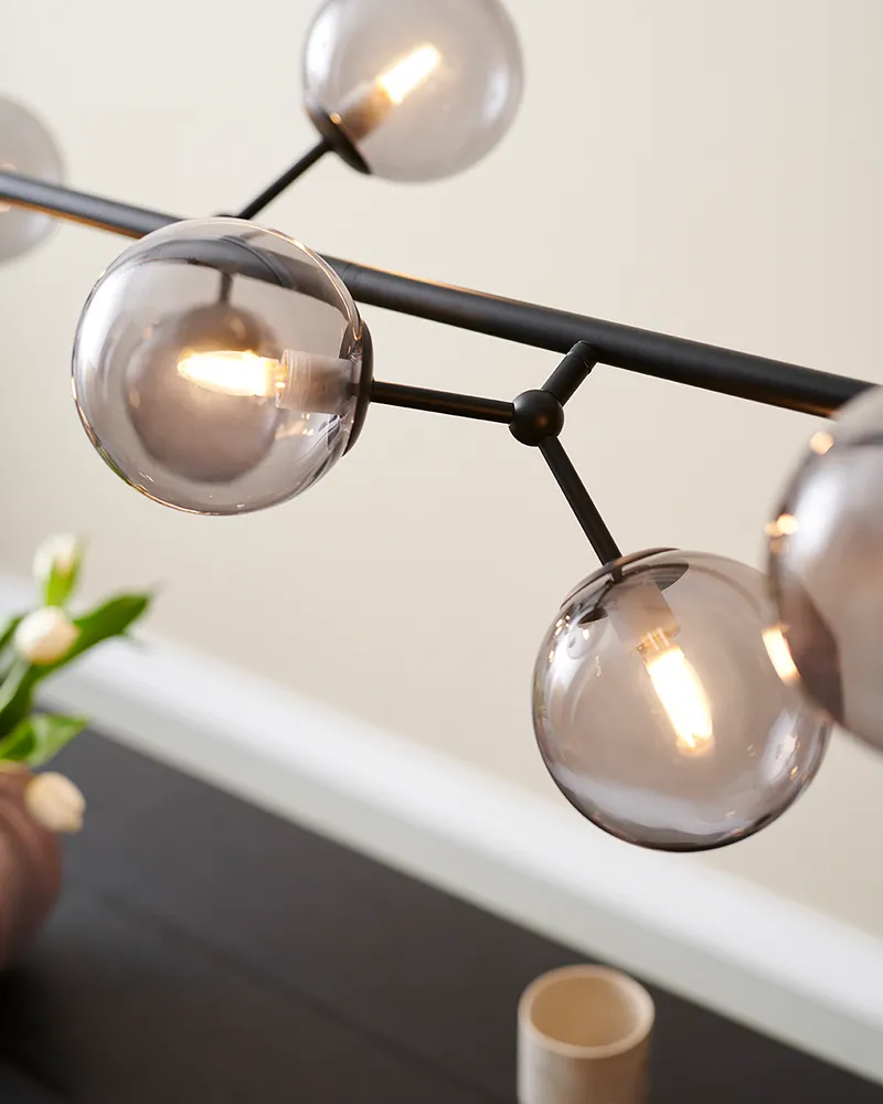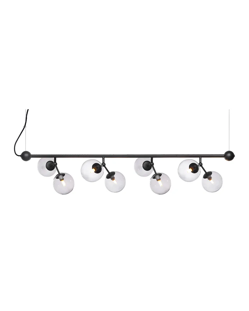 Atom Pendel benytter 8 stk. G9 på max 28w - og med en G9 fatning er der mange lyskilder at vælge imellem.