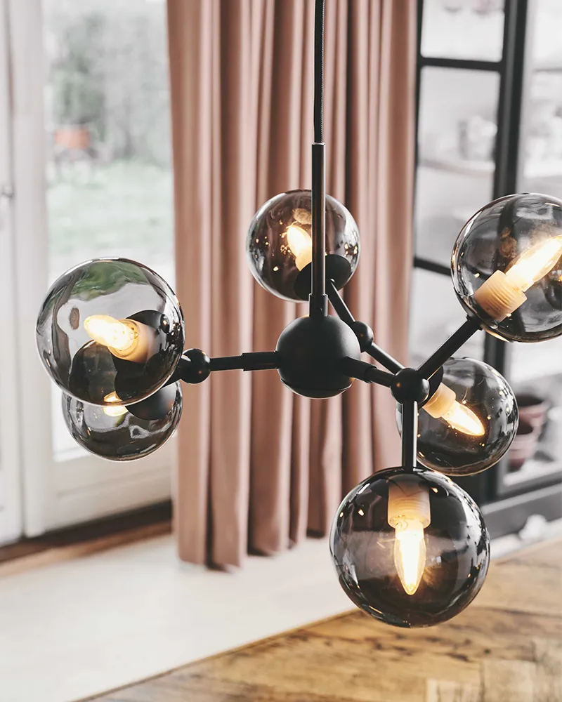 Atom Pendel benytter 6 stk. G9 på max 28w - og med en G9 fatning er der mange lyskilder at vælge imellem.