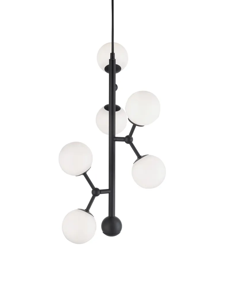 Atom Pendel benytter 6 stk. G9 på max 28w - og med en G9 fatning er der mange lyskilder at vælge imellem.