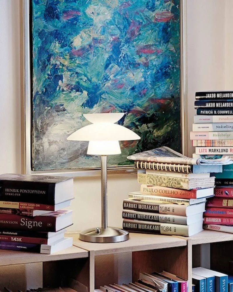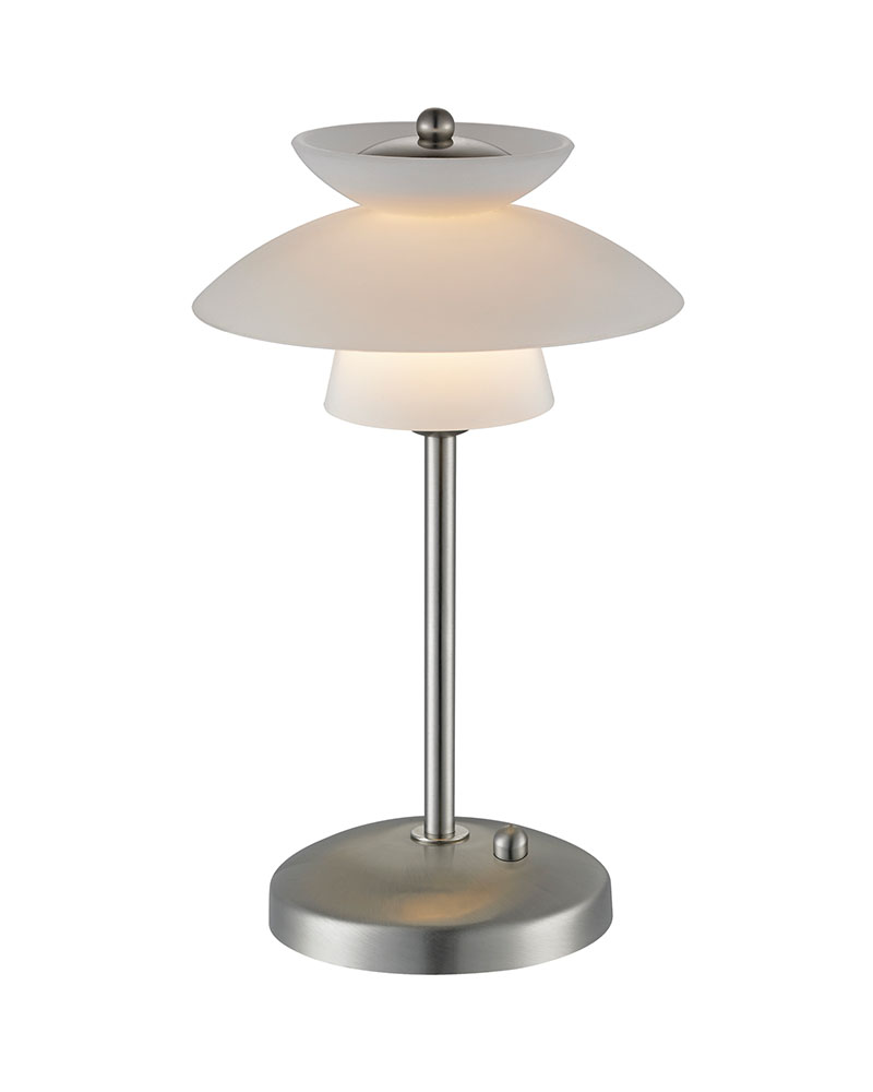 Selvom den kun måler 30 centimeter i højden og 18 centimeter i diameteren, er det en lampe, der har stor indflydelse på stemningen i rummet. Den giver et behageligt lys takket være den indbyggede lysdæmper. Materialet er opalglas, det vil sige at det er hvidt og uigennemsigtigt. Designet er af højeste klasse, men bordlampen er alligevel prisvenlig. Den kan placeres i stuen såvel som på et værelse - der er mange muligheder, når det gælder indretningen.