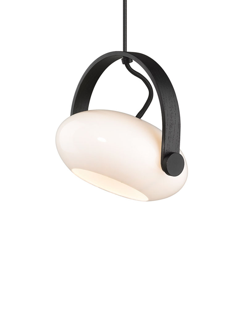 Lampen er skabt med en opal skål/skærm, som omkredser pæren, og giver et flot koncentreret lys. Ophænget er lavet i matchende træ, som danner en bøjle over lampehovedet. I serien findes der også pendler i 2 andre størrelser samt væglamper, bordlamper og gulvlamper. Alle modeller fås i både sort, hvid og opal.