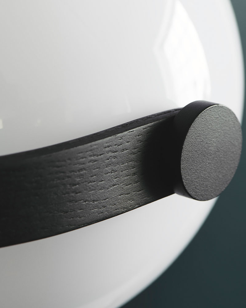 Udover pendlens bøjle, der er lavet af træ, finder vi også metal og akryl som væsentlige dele af designet. Selve pendlen er af akryl og danner en lampeskærm, der omgiver lyset fra de fleste sider. Den ovale form har naturligvis et hul i bunden, hvor lyset kan komme ud, og det kan du dreje over mod et hvilket som helst punkt i rummet. Utroligt alsidigt og med mulighed for at påvirke belysningen i rummet.