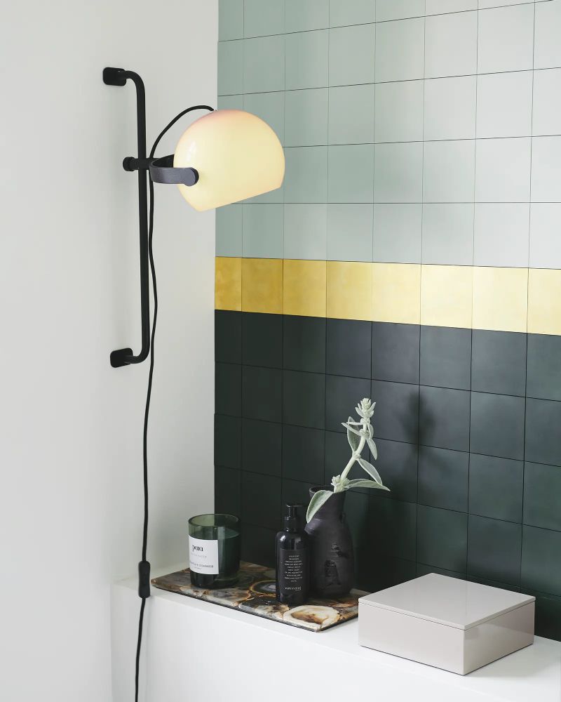 Væglampens udtryk er en smule industrielt, men den ovale lampeskærm tilfører et blødt element. Skærmen har en diameter på 18 cm. Lampen giver et behageligt lys i rummet, og lysfaldet er nemt at indstille – det kan endda klares med kun én hånd! Den tilhørende ledning er i tekstil for at bibeholde det samlede harmoniske udtryk.