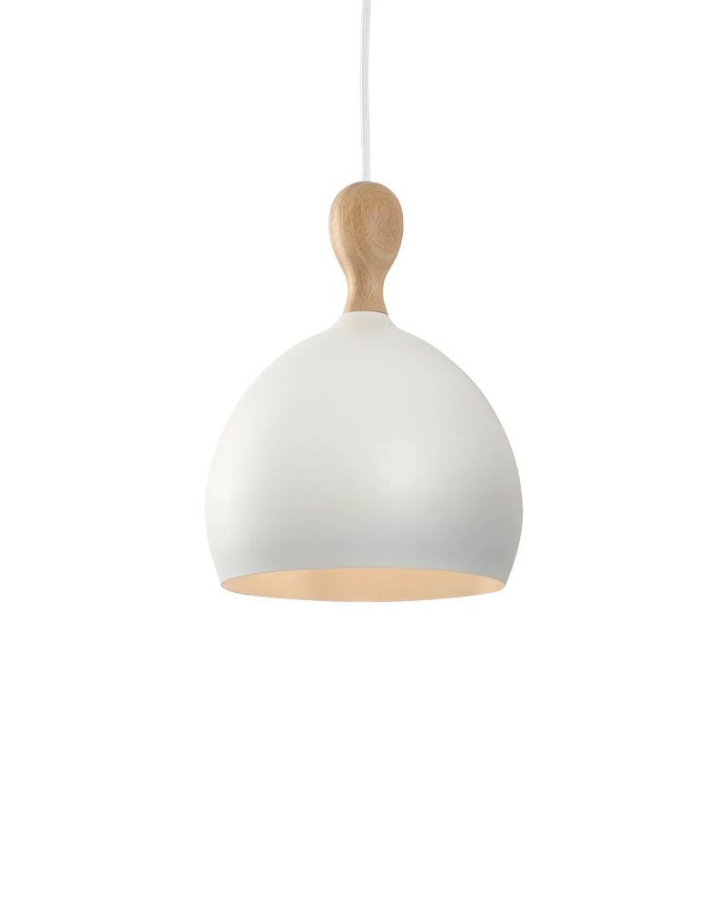 Pendlen er lavet af metal og har en diameter på 18 cm. Den buede form og kontrasten mellem det hvide metal og massivt poleret egetræ giver lampen et unikt og elegant udseende. Kombinationen af materialer skaber også en interessant balance mellem det industrielle og det naturlige.