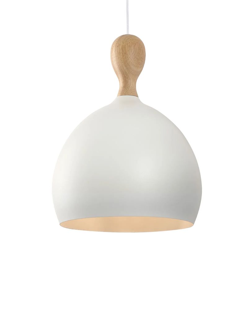 Pendlen er lavet af metal og har en diameter på 30 cm. Den buede form og kontrasten mellem det hvide metal og massivt poleret egetræ giver lampen et unikt og elegant udseende. Kombinationen af materialer skaber også en interessant balance mellem det industrielle og det naturlige.