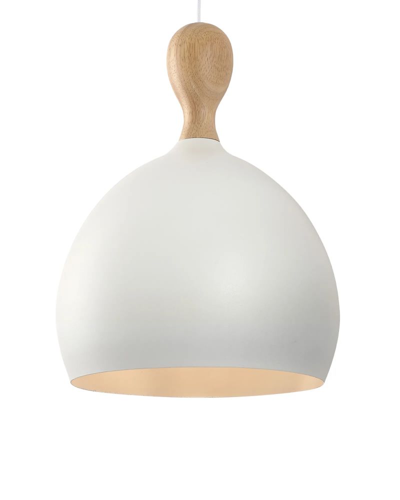 Pendlen er lavet af metal og har en diameter på 30 cm. Den buede form og kontrasten mellem det hvide metal og massivt poleret egetræ giver lampen et unikt og elegant udseende. Kombinationen af materialer skaber også en interessant balance mellem det industrielle og det naturlige.