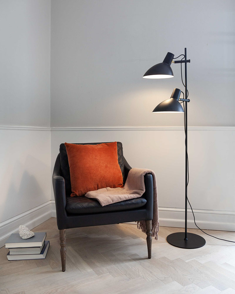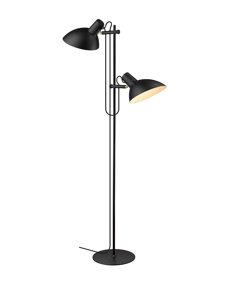 for pengene. Det synes vi egentlig han er sluppet ret godt fra da han designede Metropole Gulvlampe 2-arme Sort.