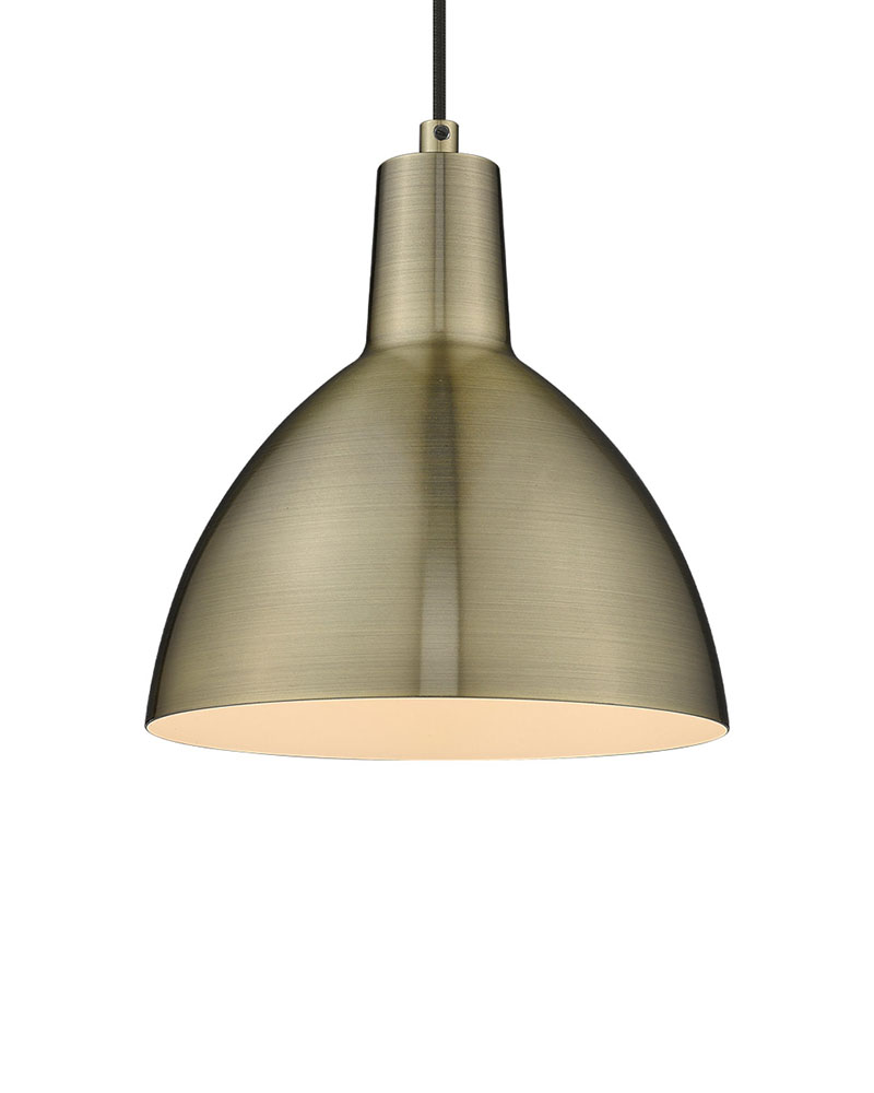 på hhv. 20 og 25 centimeter der både kan bruges alene eller i par eksempelvis over spisebordet eller sofabordet. Og hvis farven antik messing ikke er lige dig, fås lampen også i en mere traditionel mat sort.