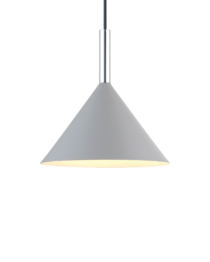 Loftslampen er produceret i metal og kommer i en flot men afdæmpet grå/krom farve. Du kan også få lampen i hvid eller sort. Der medfølger en to meter lang ledning.