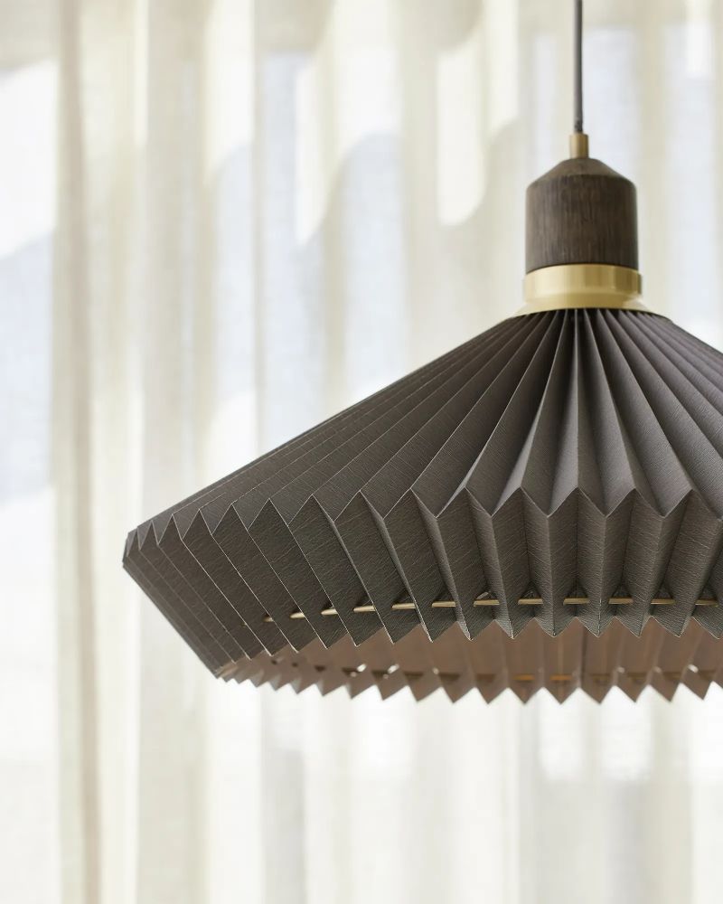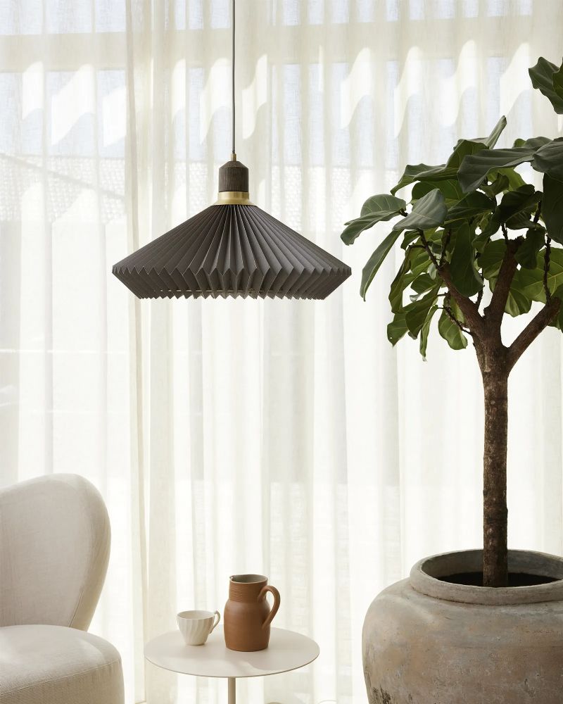 Paris pendlen har fra første øjeblik fundet en plads i vores hjerter. Den klassiske plisseskærm er altid et sikkert hit, men kombinationen med den smukke fatning i mørk olieret egetræ med små messing detaljer giver et moderne twist til en ellers traditionel