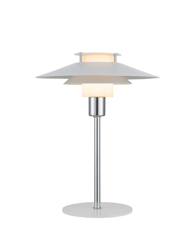 Det opaliserede glas tættest på pæren sikrer at der gives et behageligt og blødt lys som ikke blænder. De smukke hvidlakerede metalskærme sørger for at hovedparten af lyset koncentreres i nedadgående retning mens en del af det øvrige lys sendes i andre retninger og bidrager til en dæmpet oplysning at det øvrige rum. Derudover har Rivoli Bordlampe nogle skønne detaljer i krom der giver lampen sit eget unikke udtryk samt en afbryder på ledningen, ca. 30cm fra lampen.