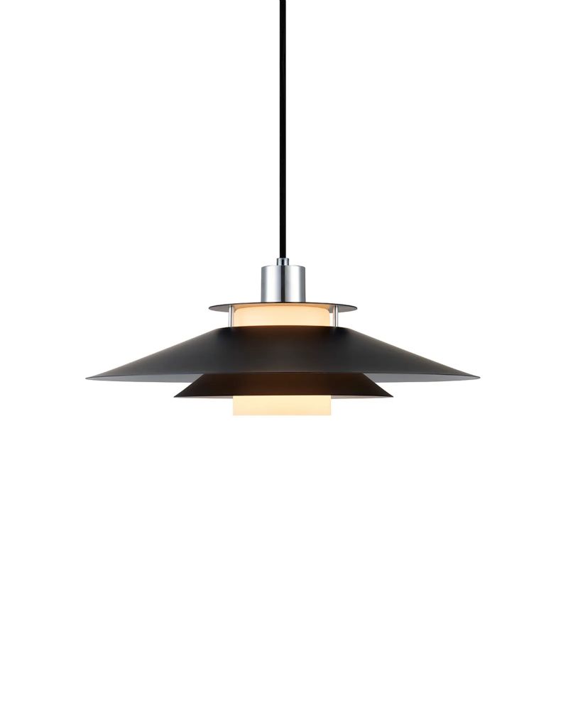 Det opaliserede glas tættest på pæren sikrer at der gives et behageligt og blødt lys som ikke blænder. De smukke sortlakerede metalskærme sørger for at hovedparten af lyset koncentreres i nedadgående retning mens en del af det