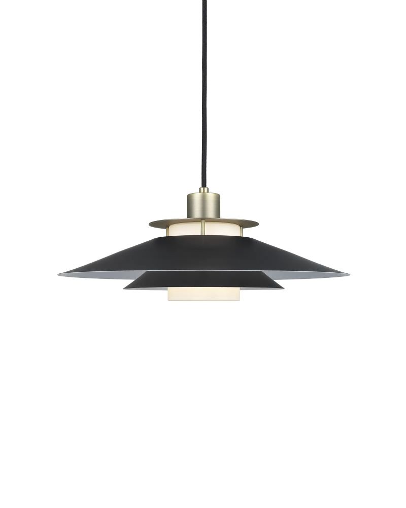 Det opaliserede glas tættest på pæren sikrer at der gives et behageligt og blødt lys som ikke blænder. De smukke sortlakerede metalskærme sørger for at hovedparten af lyset koncentreres i nedadgående retning mens en del af det