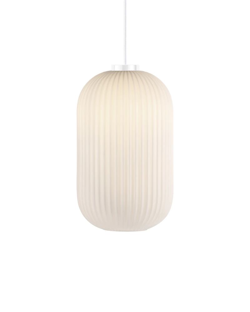 Designet er en kombination af klassisk og vintage inspiration, med et moderne tvist. Den rillede struktur i glasset giver lampen et ekstra kant, og kan minde om de kendte Lyngby vaser. Det opalhvide glas sikrer dig en perfekt spredning på lyset, så du får et behageligt lys rundt i rummet du hænger lampen i.