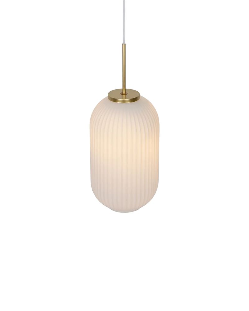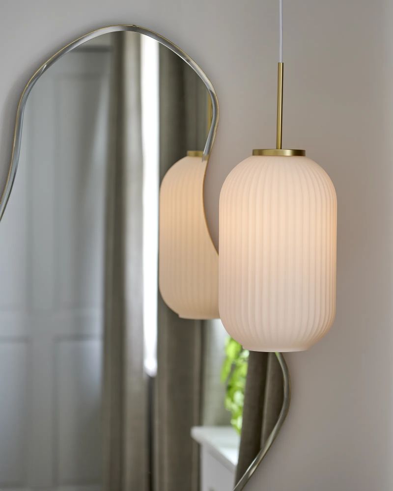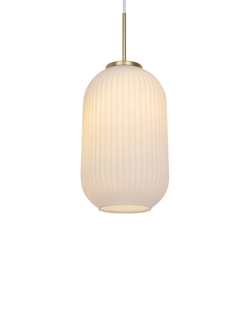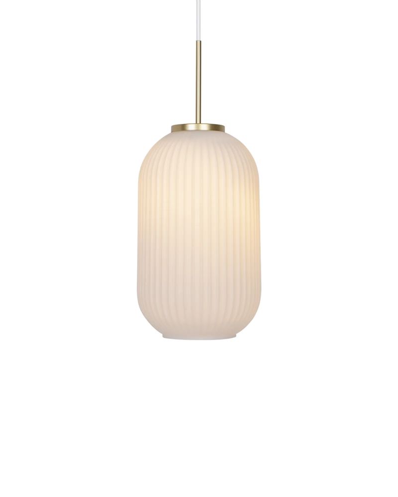 Milford er en dekorativ serie, hvor det opalhvide mundblæste glas skaber et blødt og nærmest "plisseret" look. Designet er klassisk og vintageinspireret og afbalanceres med messingophænget, der giver et moderne tvist. Kombinationen af de organiske former og den rillede overflade skaber elegance og lader et blødt og varmt lys sprede sig i rummet.