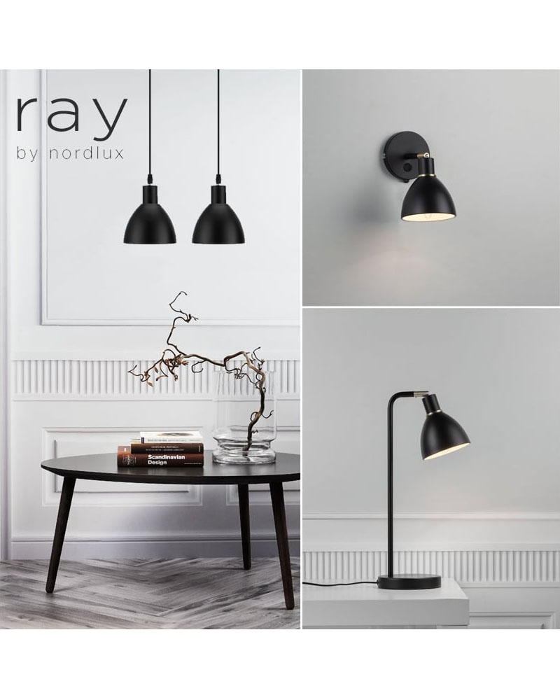 Ray serien fra Nordlux er en serie i et klassisk design med et moderne udtryk. Serien laves i hhv sort og opal/krom og fås også som pendel- og bord- og gulvlampe.