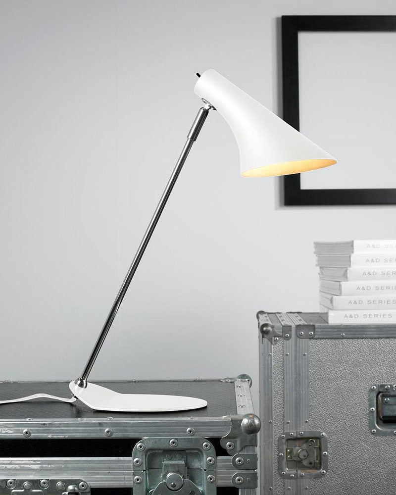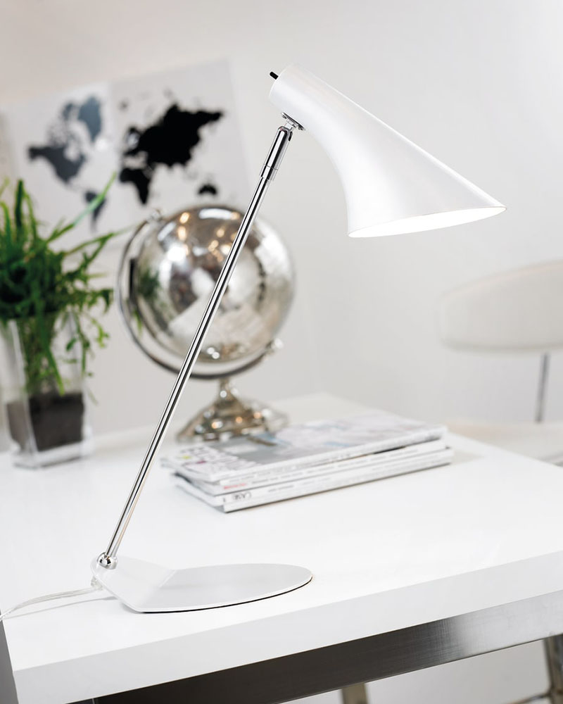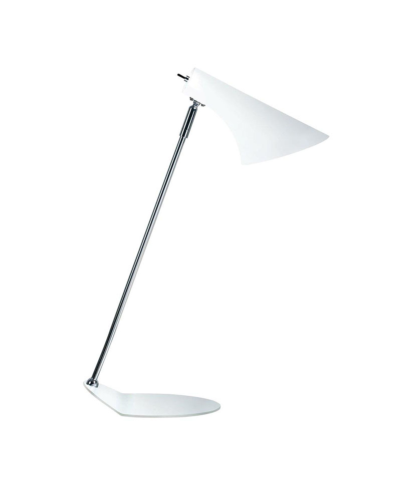 Lampen er fremstillet med fod og lampeskærm i robust hvidt metal. Skærmen har en afbryderknap, kan justeres op og ned og giver et godt og hyggeligt lys. Lampen kan sættes til en almindelig stikkontakt og har en E14 fatning til pærer på max 40 watt. En flot lampe der både kan benyttes som skrivebordslampe, pyntelampe eller f.eks som læselampe placeret i vindueskarm bag lænestolen.
