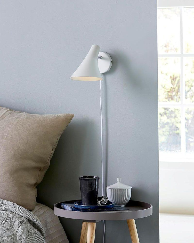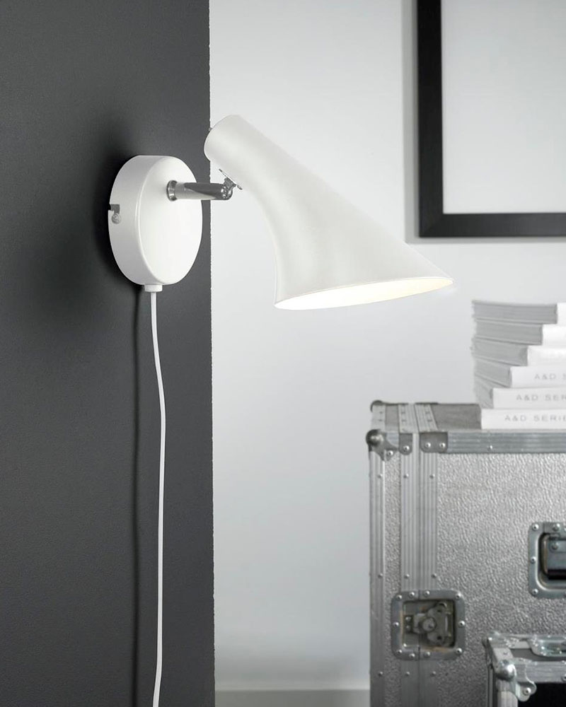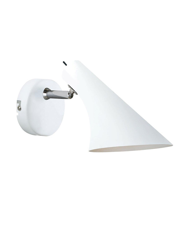 Lampen er fremstillet med en hvid lampeskærm i robust metal. Skærmen har en afbryderknap, kan justeres op og ned og giver et godt og hyggeligt lys. Lampen kan sættes til en almindelig stikkontakt og har en E14 fatning til pærer på max 40 watt. En flot lampe der både kan benyttes som læselampe, sengelampe eller dekorationslampe i serier med flere lamper.