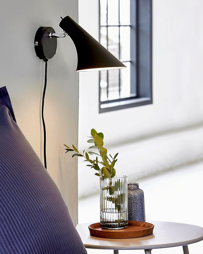 Lampen er fremstillet med en sort lampeskærm i robust metal. Skærmen har en afbryderknap, kan justeres op og ned og giver et godt og hyggeligt lys. Lampen kan sættes til en almindelig stikkontakt og har en E14 fatning til pærer på max 40 watt. En flot lampe der både kan benyttes som læselampe, sengelampe eller dekorationslampe i serier med flere lamper.