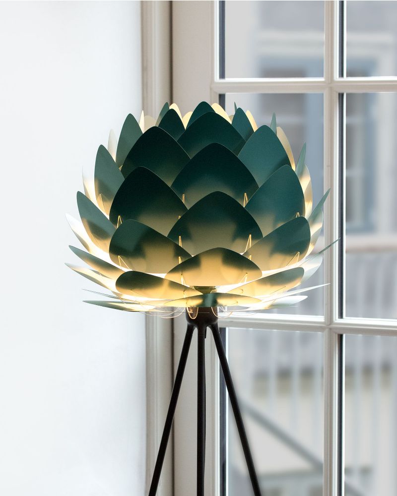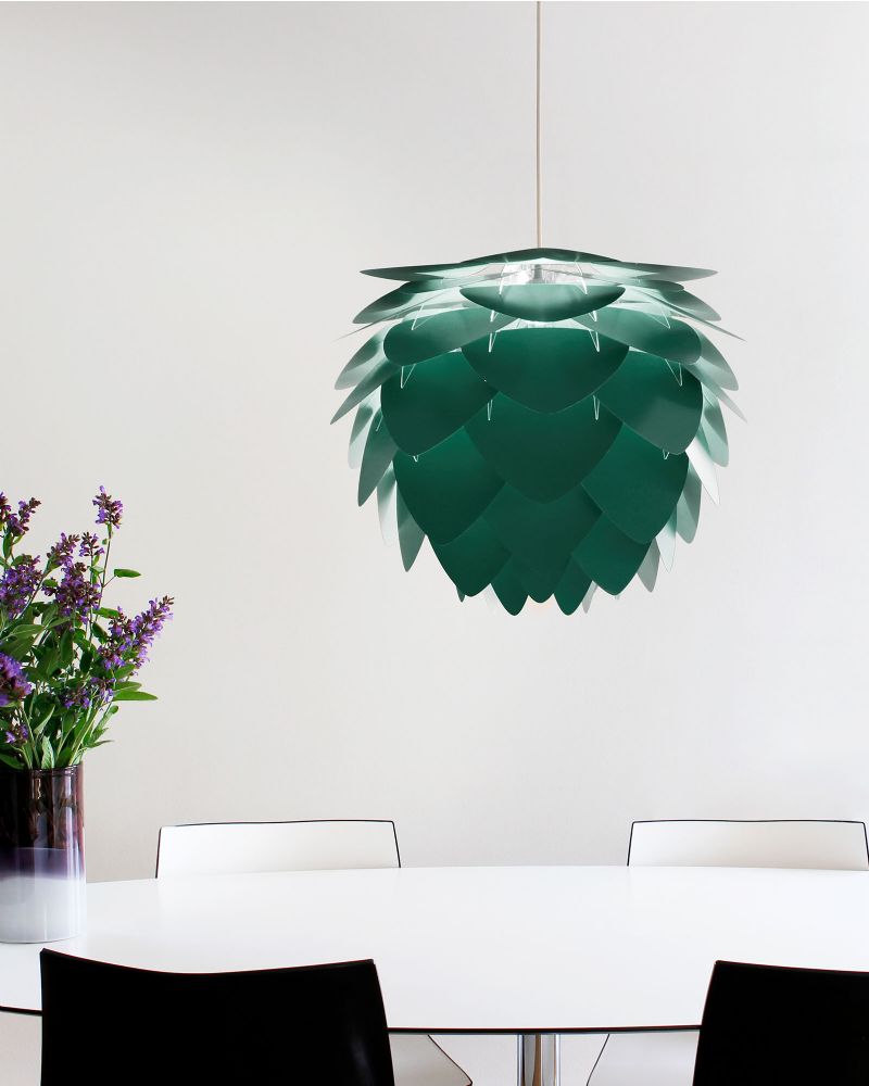 Lampeskærmen består af en række aluminiumsplader, der er sat sammen til en smuk kogleform. Skærmen kan bruges som pendel, gulvlampe, bordlampe og væglampe. Alle farverne fås i mini- og mediumstørrelse.| Mærke | Umage (tidligere Vita) |
