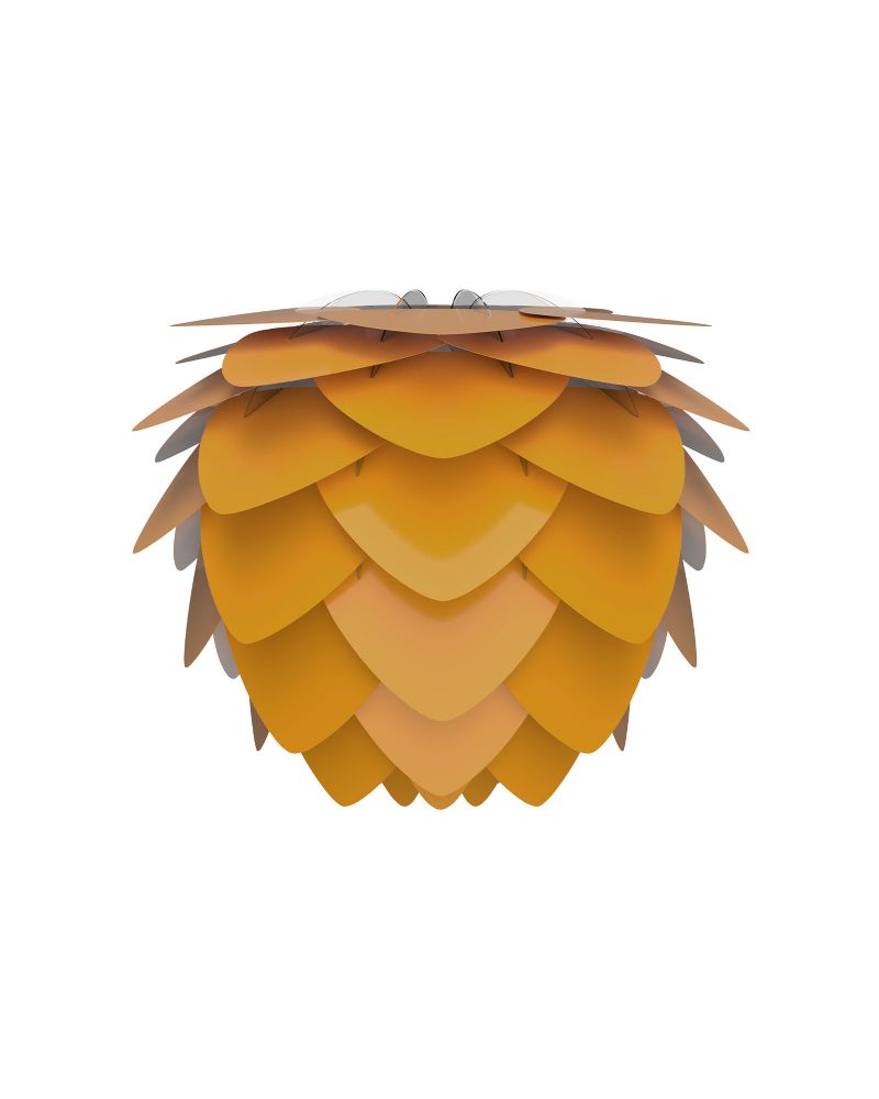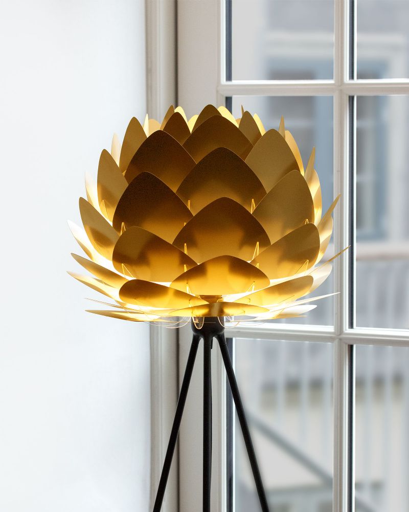 Lampeskærmen består af en række aluminiumsplader, der er sat sammen, så de danner en smuk kogleform. Umage har også lanceret en særudgave af Aluvia, nemlig en imponerende messingmodel. Alle farverne fås også i en mindre størrelse med en diameter på 40cm.