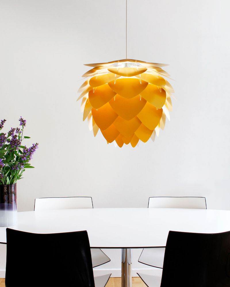 Med lanceringen af Aluvia lampeskærmene har Umage Design Team skabt en række lamper, hvor det klassiske look får et spændende tvist. Det skyldes bl.a. de syv farver, som lampeskærmen fås i. Farverne er iøjefaldende og samtidig velafbalancerede, så de først og fremmest skaber ro i hjemmet. Vælg fx den kølige forest/grøn, gå efter det modige design med ruby/red eller forkæl dig selv med jubilæumsudgaven i messing.