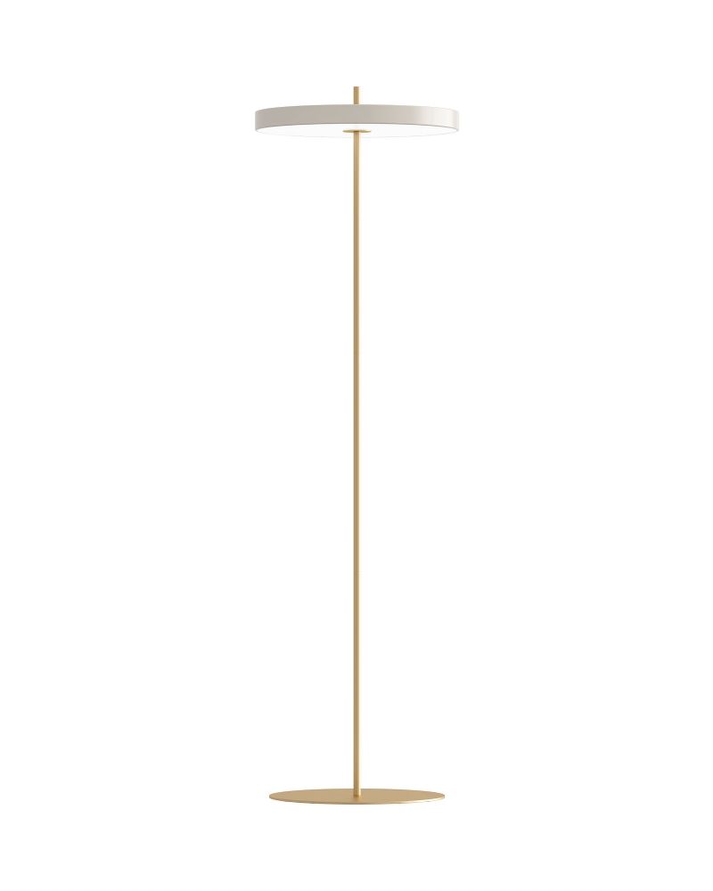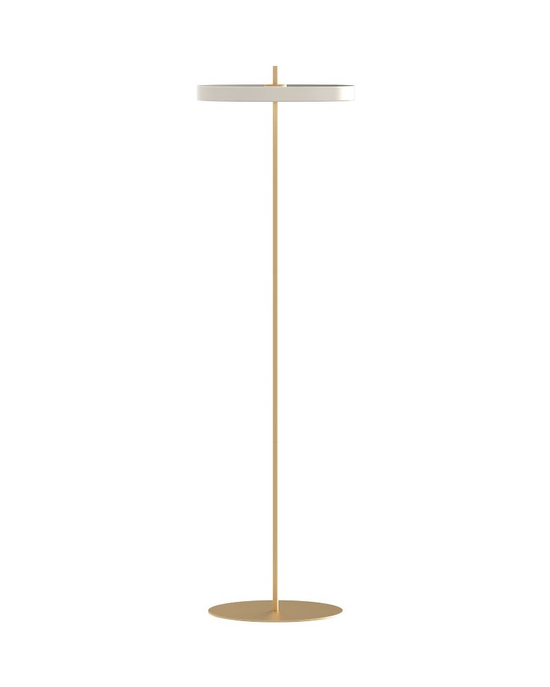 En helt igennem fantastisk LED gulvlampe i et moderne dansk design - og så med et lækkert og behageligt lys. Asteria Gulvlampe fra danske Umage, er en slank og minimalistisk lampe med et slankt stel i messing, indrammet af en stabil fod - ligeledes i messing - og den 43 centimeter store perlehvide lampeskærm. På toppen kan du på den lille messingtop justere lysstyrken via den indbyggede dæmper.