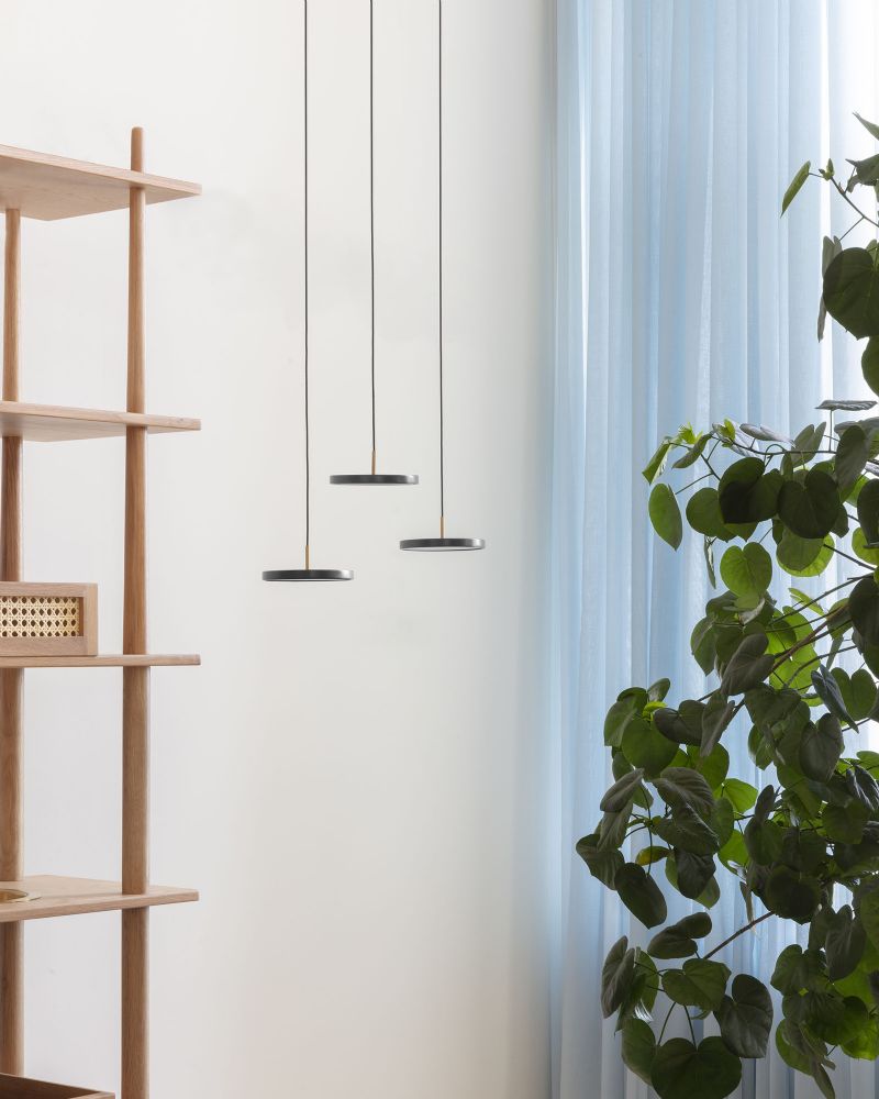 Asteria pendlen fås i den mindste version - som vist her i antracit grå - med en diameter på blot 15 centimer. Denne version er specielt velegnet til at sidde i serie - f.eks. langs et smalt køkkenbord eller i klynge i hjørnet af stuen. Den lidt større Asteria Mini