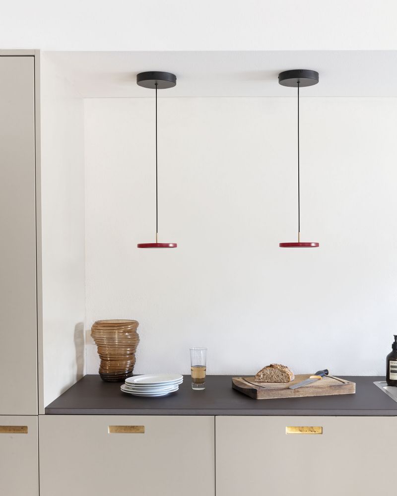 Asteria pendlen fås i den mindste version - som vist her i rød - med en diameter på blot 15 centimer. Denne version er specielt velegnet til at sidde i serie - f.eks. langs et smalt køkkenbord eller i klynge i hjørnet af stuen. Den lidt større Asteria Mini