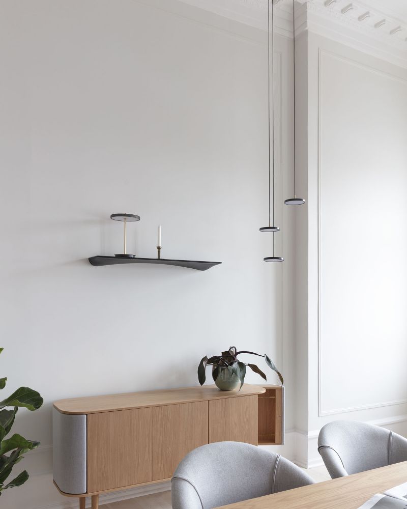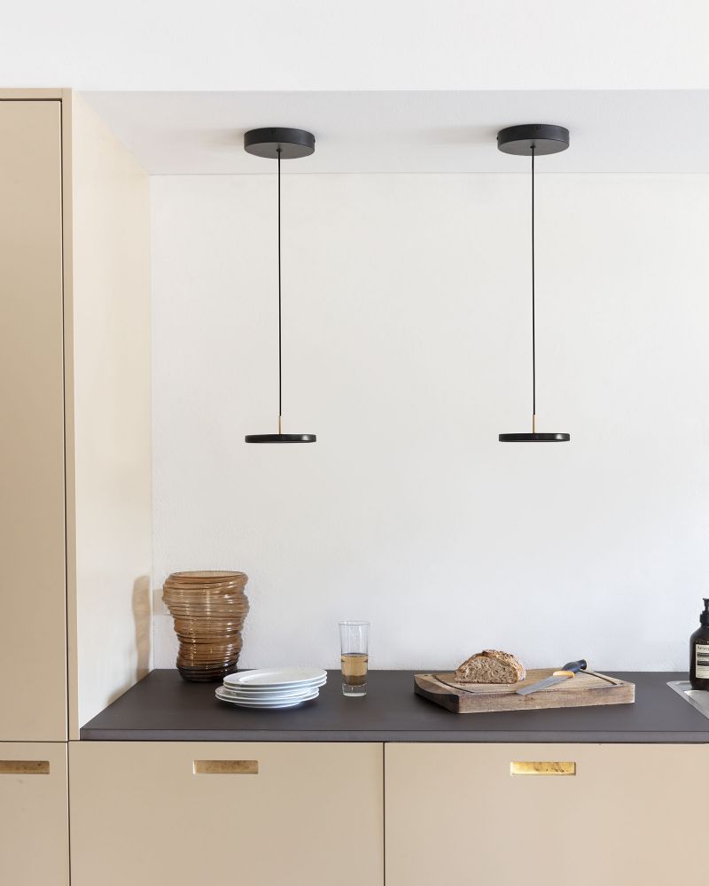 Asteria pendlen fås i den mindste version - som vist her i sort - med en diameter på blot 15 centimer. Denne version er specielt velegnet til at sidde i serie - f.eks. langs et smalt køkkenbord eller i klynge i hjørnet af stuen. Den lidt større Asteria Mini