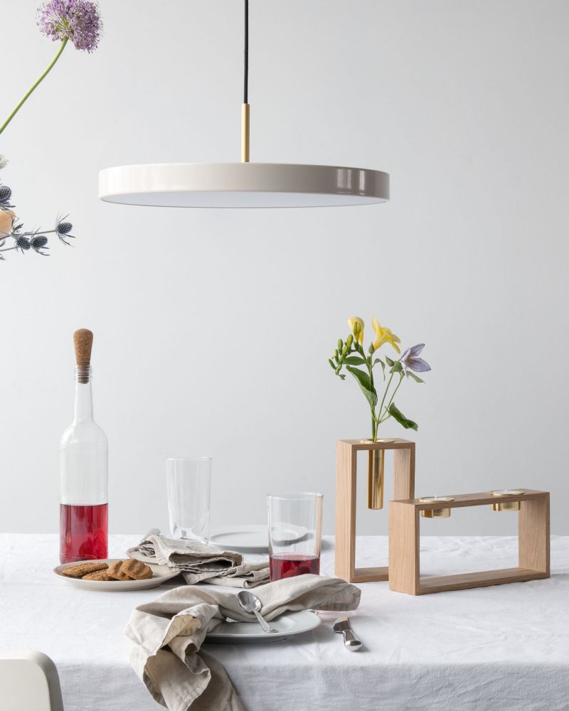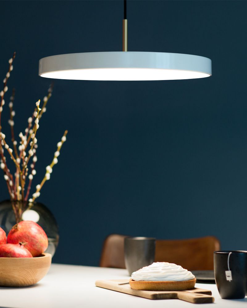 et lidt større spisebord eller f.eks. over køkkenøen. Du kan også få Asteria Micro der med sin diameter på blot 15 cm tager sig flot ud i serier på flere styk, eller f.eks i en klynge i hjørnet af stuen.