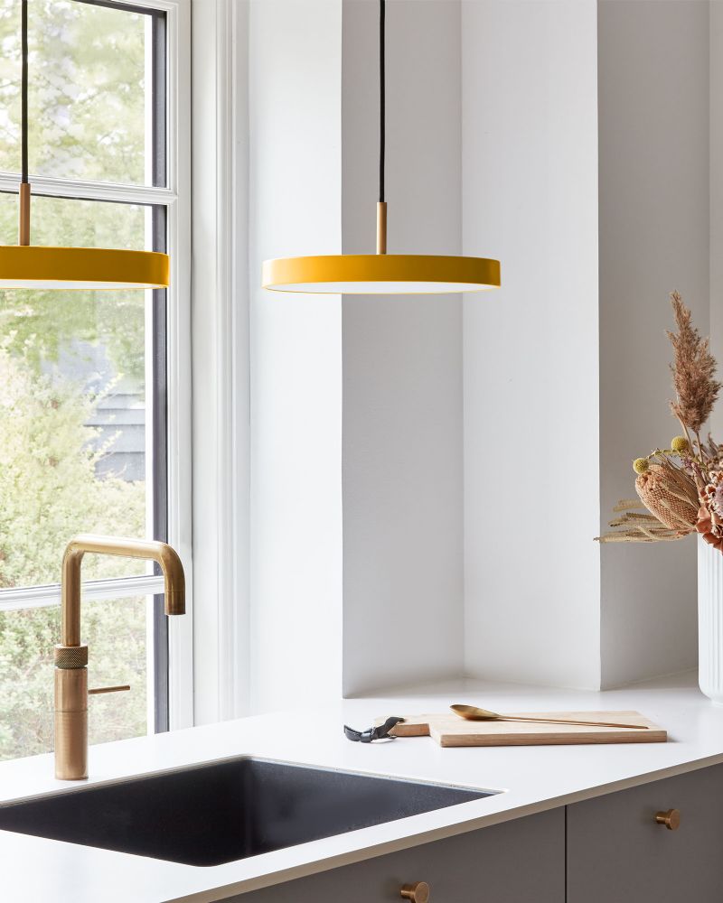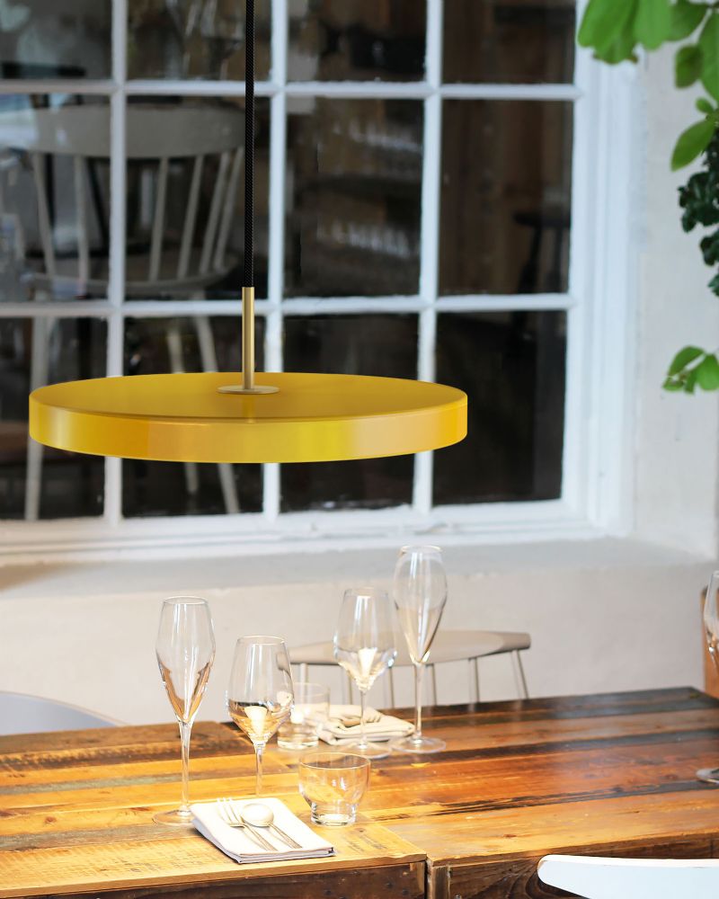 LED pendellampen Asteria Mini Saffron Yellow er en succesfuld kombination af teknologi, design og funktionalitet, bygget i kvalitetsmaterialer og kombineret med moderne LED teknologi i en smuk gul skærm. Lampen fra det danske firma Umage, er designet med et slankt, elegant og minimalistisk design som passer til ethvert moderne hjem. Lyset kan efter behov dæmpes og dermed sikre en behagelig atmosfære og en stemningsfuld belysning.
