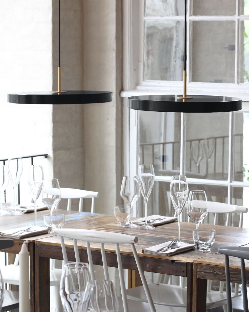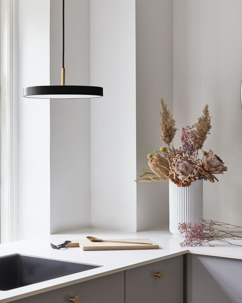 et lidt større spisebord eller f.eks. over køkkenøen. Du kan også få Asteria Micro der med sin diameter på blot 15 cm tager sig flot ud i serier på flere styk, eller f.eks i en klynge i hjørnet af stuen.