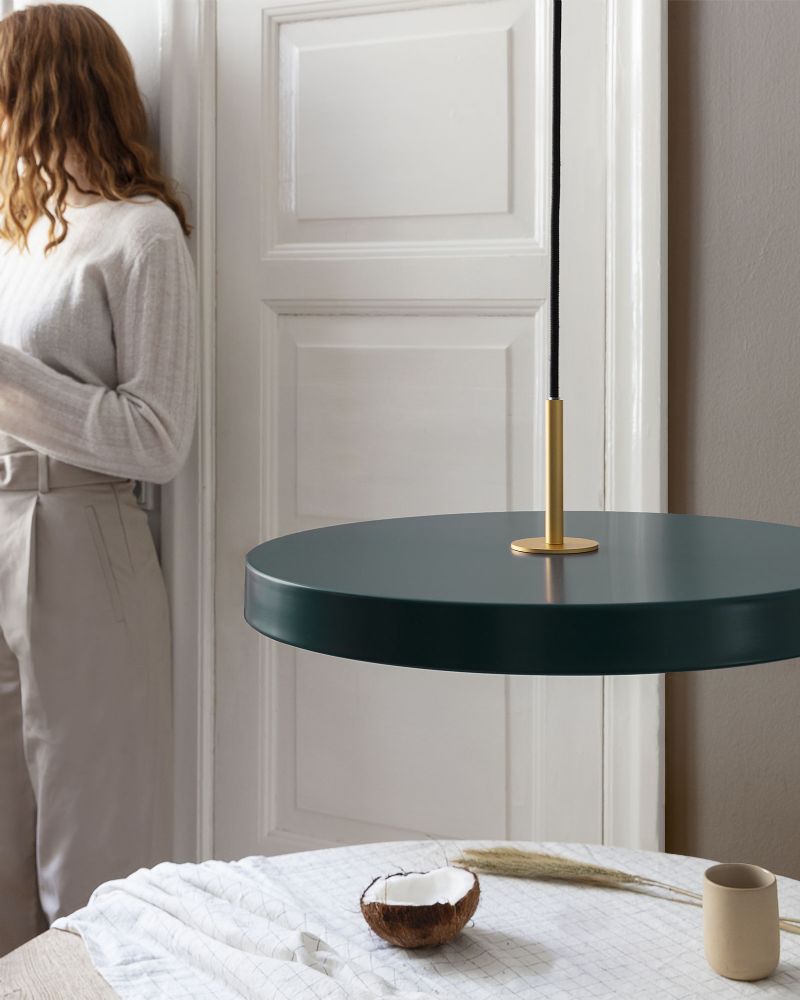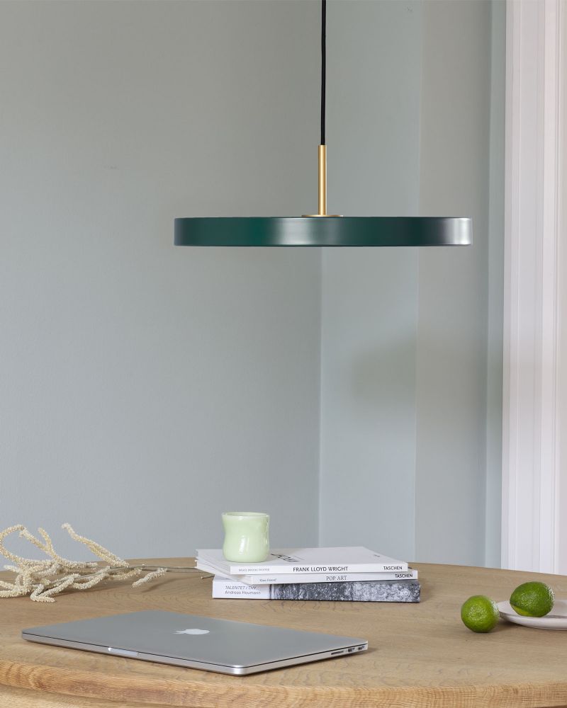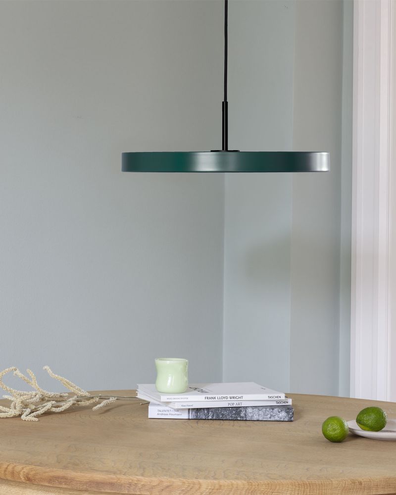 LED pendellampen Asteria Forest Green er en succesfuld kombination af teknologi, design og funktionalitet, bygget i kvalitetsmaterialer og kombineret med moderne LED teknologi i en smuk grøn skærm. Lampen fra det danske firma Umage, er designet med et slankt, elegant og minimalistisk design som passer til ethvert moderne hjem. Lyset kan efter behov dæmpes og dermed sikre en behagelig atmosfære og en stemningsfuld belysning.