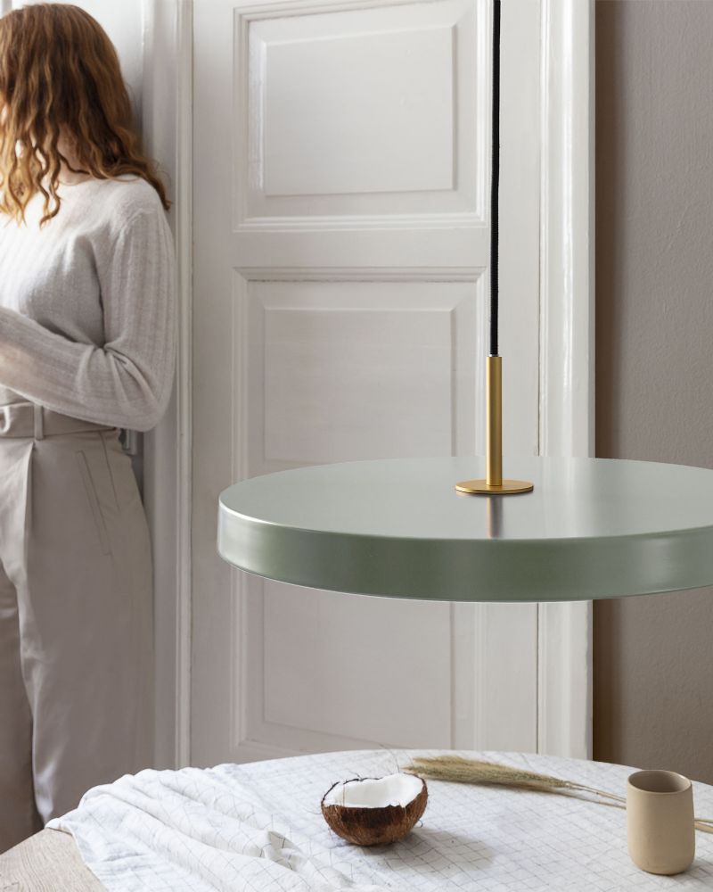 LED pendellampen Asteria Nuance Olive er en succesfuld kombination af teknologi, design og funktionalitet, bygget i kvalitetsmaterialer og kombineret med moderne LED teknologi i en smuk olivenfarvet skærm. Lampen fra det danske firma Umage, er designet med et slankt, elegant og minimalistisk design som passer til ethvert moderne hjem. Lyset kan efter behov dæmpes og dermed sikre en behagelig atmosfære og en stemningsfuld belysning.