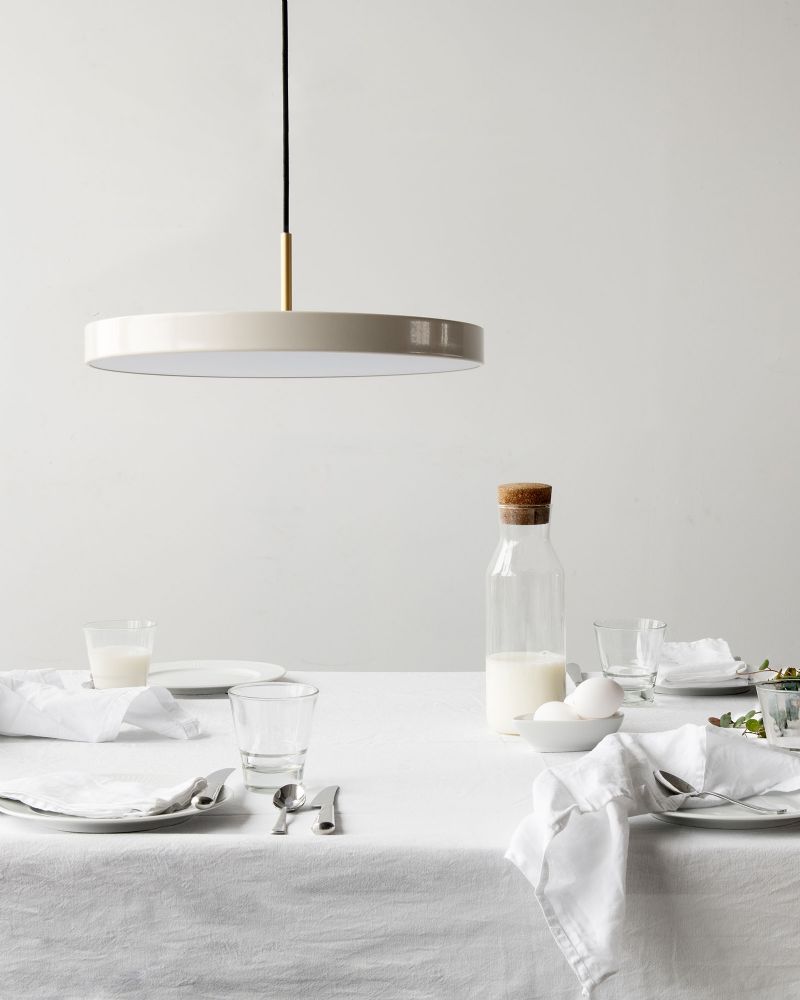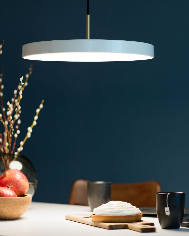Asteria pendlen fås i den store version - som vist her - med en diameter på 43 centimeter. Denne egner sig godt over spisebordet eller køkkenøen. Den lidt mindre version på 31 centimeter er ideel til det lidt mindre køkkenbord eller i sæt á to eller tre