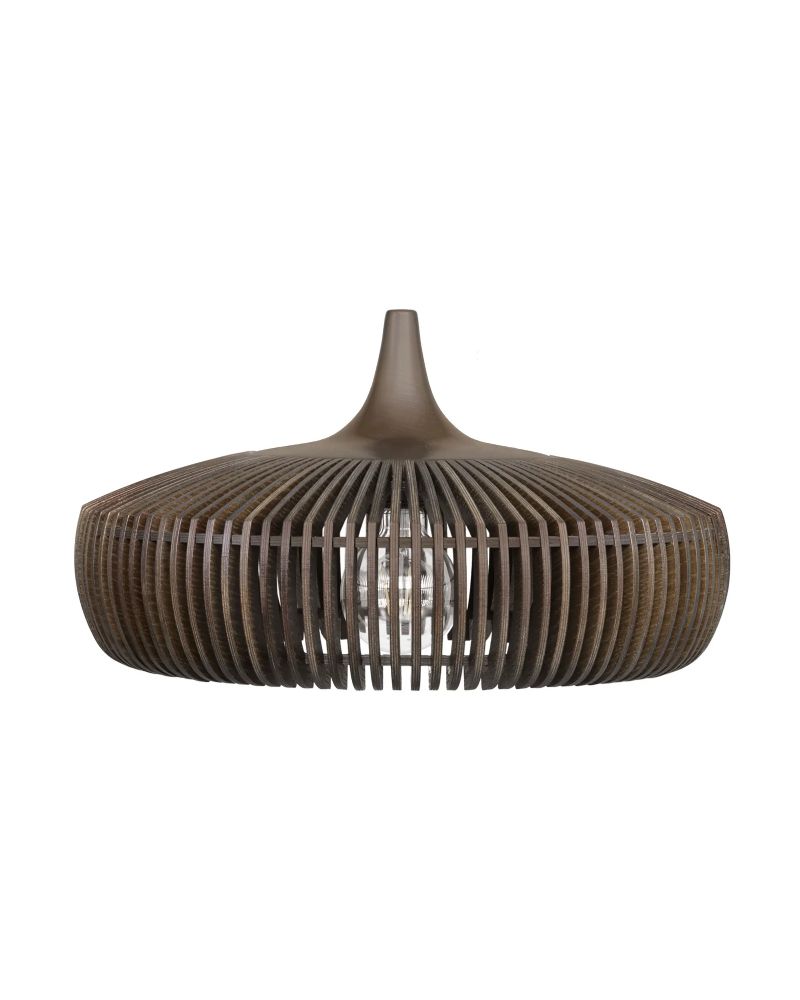 Clava Dine Wood skærmen er en smuk og stilfuld lampe, der kaster et behageligt lys ud i rummet og skaber en hyggelig atmosfære. Brug den som blikfang over spisebordet, både i private hjem eller i restauranter, og nyd godt af det nedadgående lys. Lampeskærmen kan - udover denne version i mørk olieret eg - fås i to andre farver; lys eg og sort eg.