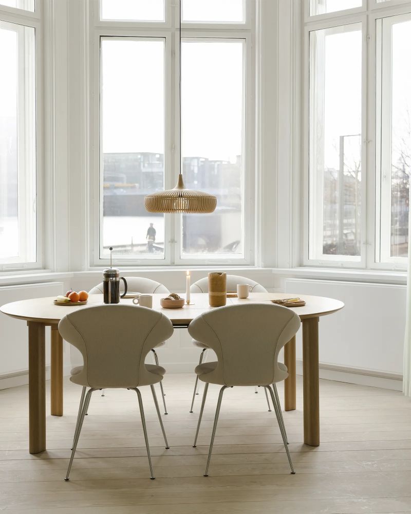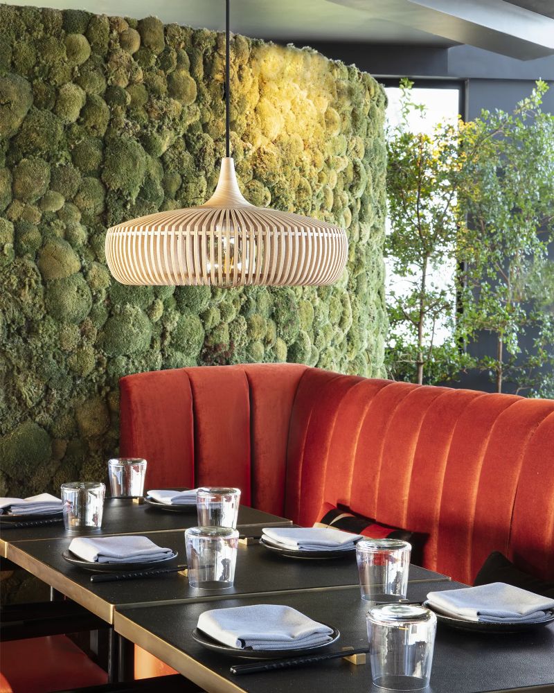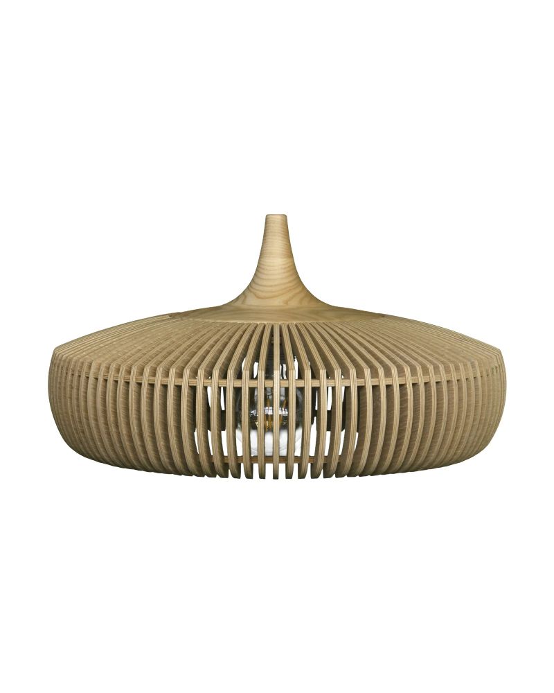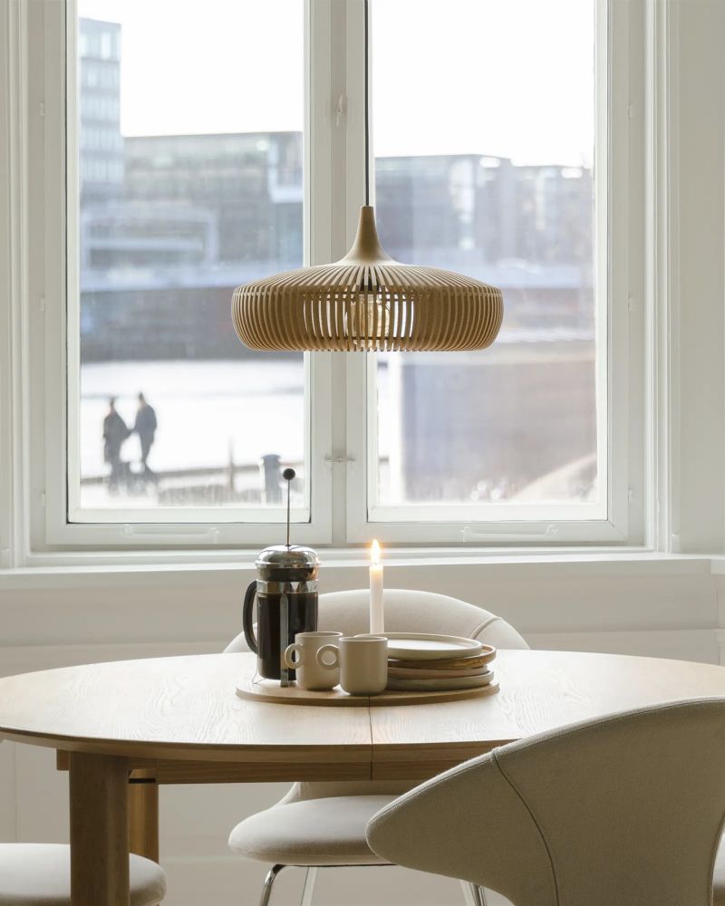 Clava Dine Wood skærmen er en smuk og stilfuld lampe, der kaster et behageligt lys ud i rummet og skaber en hyggelig atmosfære. Brug den som blikfang over spisebordet, både i private hjem eller i restauranter, og nyd godt af det nedadgående lys. Lampeskærmen kan - udover denne version i lys olieret eg - fås i to andre farver; mørk eg og sort eg.