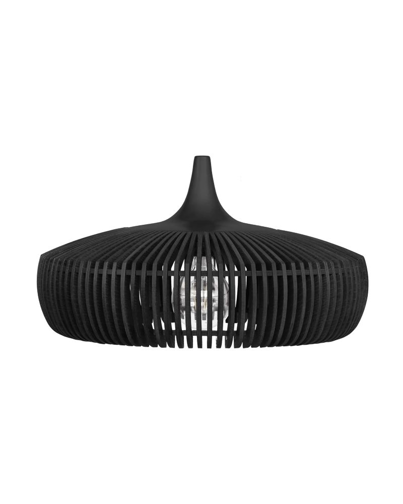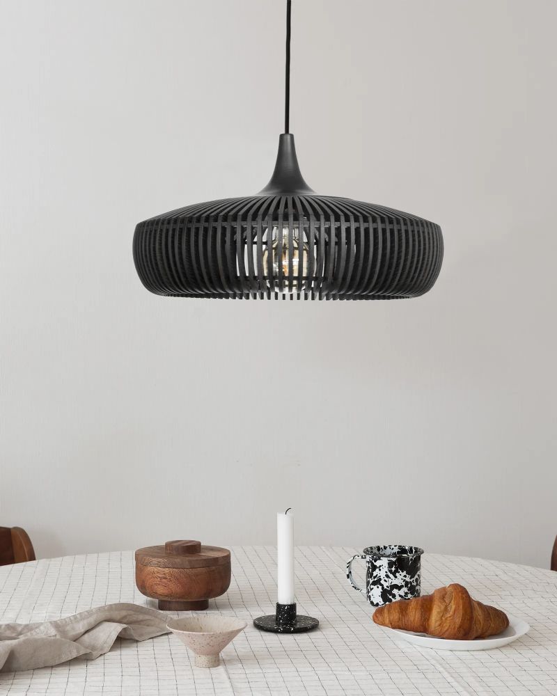 Clava Dine Wood skærmen er en smuk og stilfuld lampe, der kaster et behageligt lys ud i rummet og skaber en hyggelig atmosfære. Brug den som blikfang over spisebordet, både i private hjem eller i restauranter, og nyd godt af det nedadgående lys. Lampeskærmen kan - udover denne version i sort olieret eg - fås i to andre farver; lys eg og mørk eg.