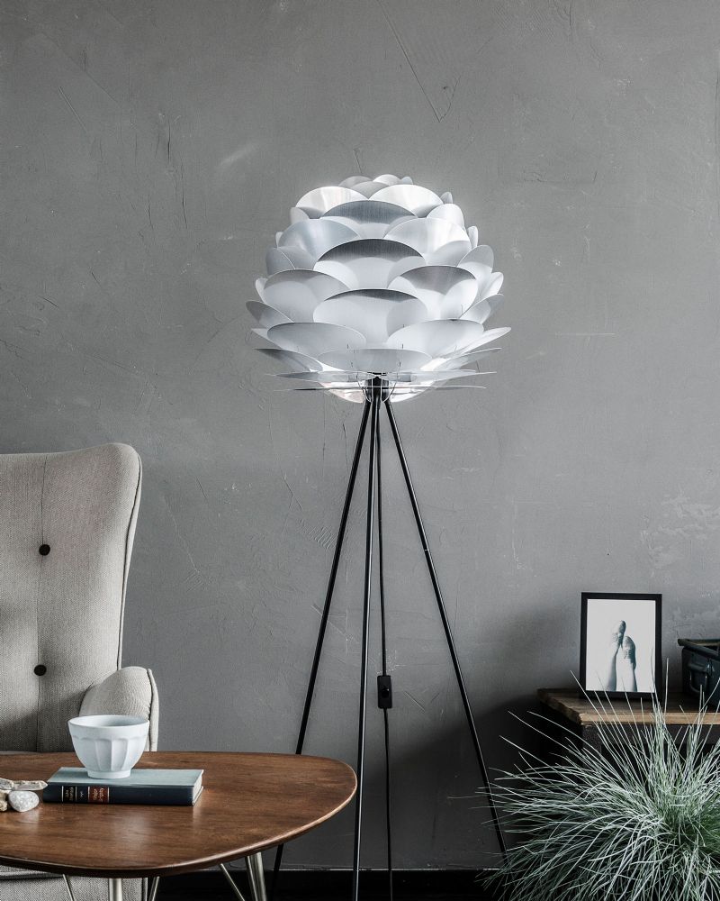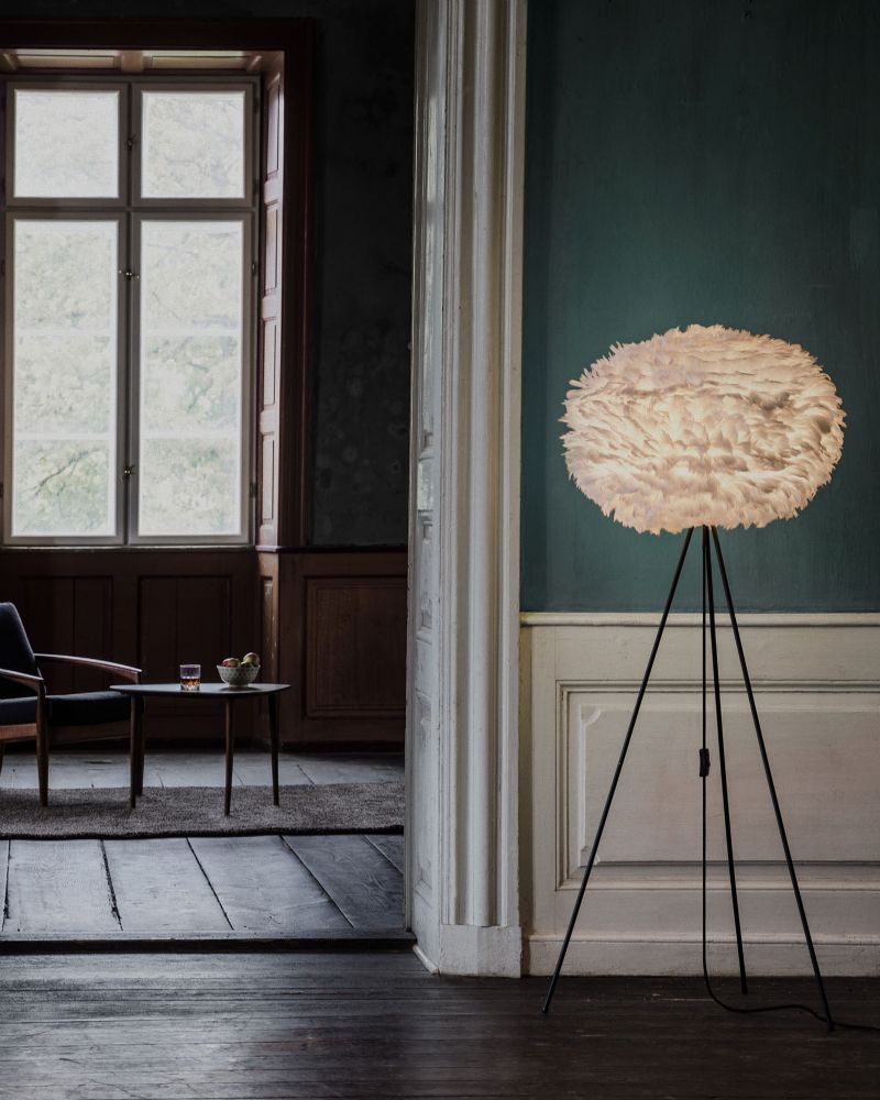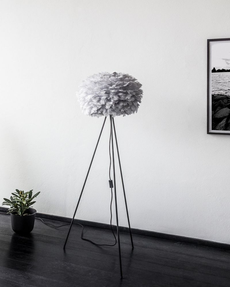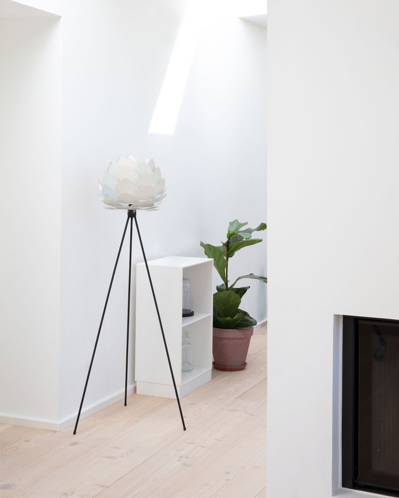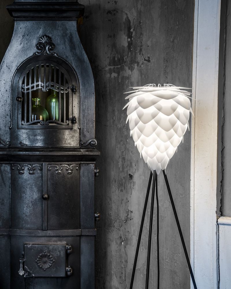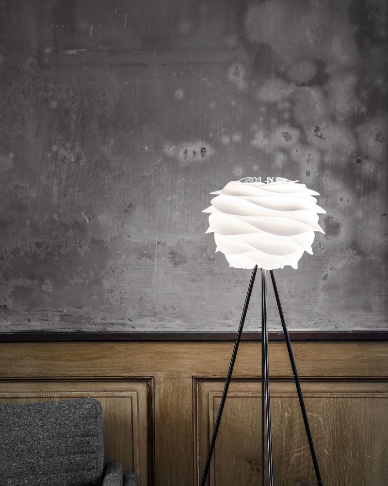 Gulvstanderen kommer uden lapeskærm, og kan tilpasses alle Umages mange lampeskærme. (Samt mange andre skærme, da der benyttes standard montering) Du kan dermed skabe nøjagtig det look og den stemning som du er på jagt efter. Stativiet fås også i hvid og begge farver kan desuden fås i mindre udgaver som bordstander.